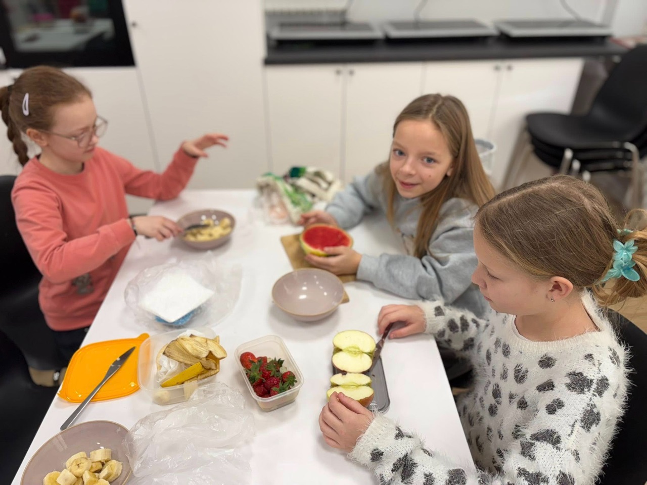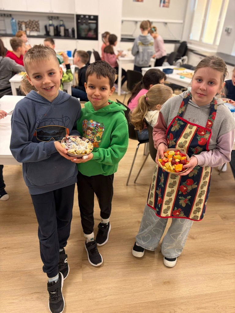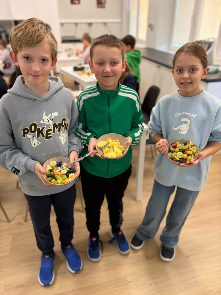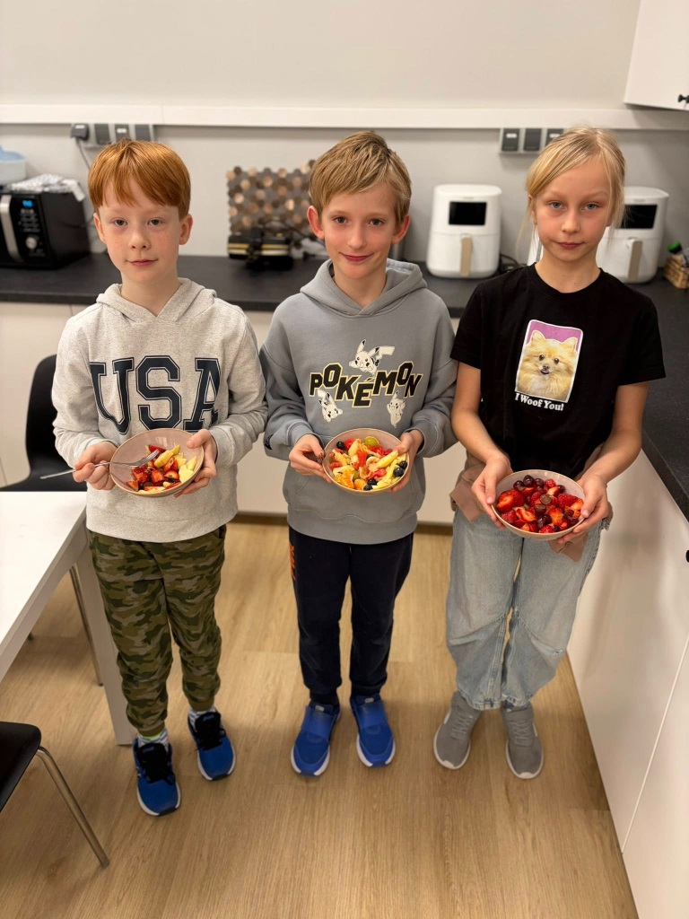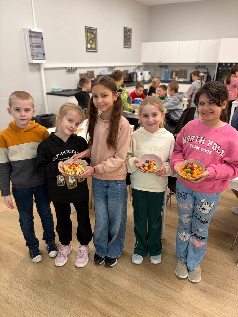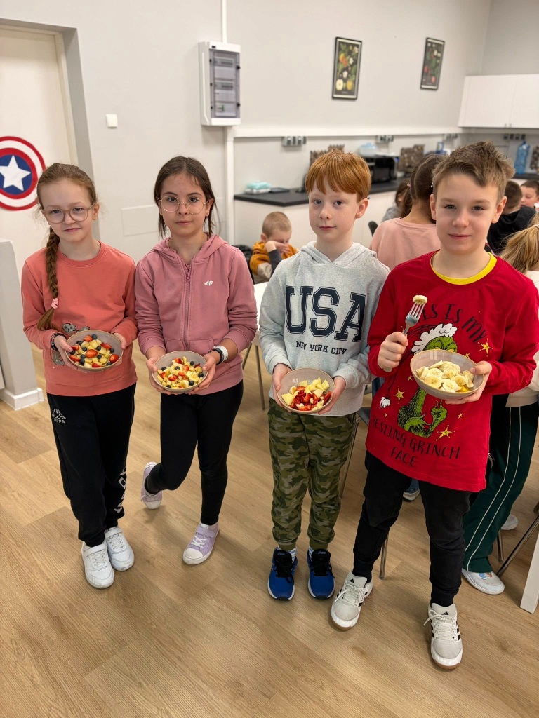 Uczniowie klasy 3b spędzili dzisiejszy poranek w pracowni kulinarnej. Na początku, podczas zajęć języka angielskiego, utrwalili nazwy owoców w języku angielskim oraz zaśpiewali piosenkę związaną z tym tematem.