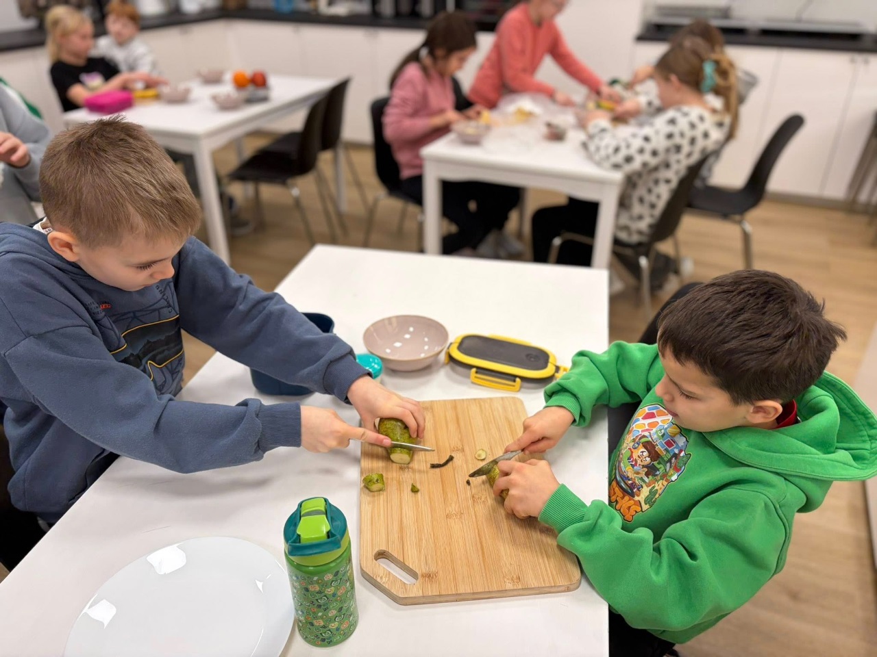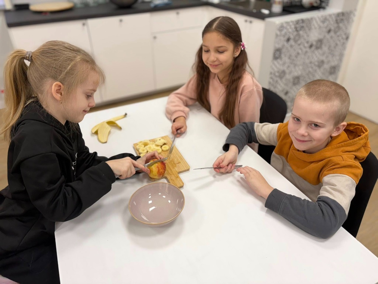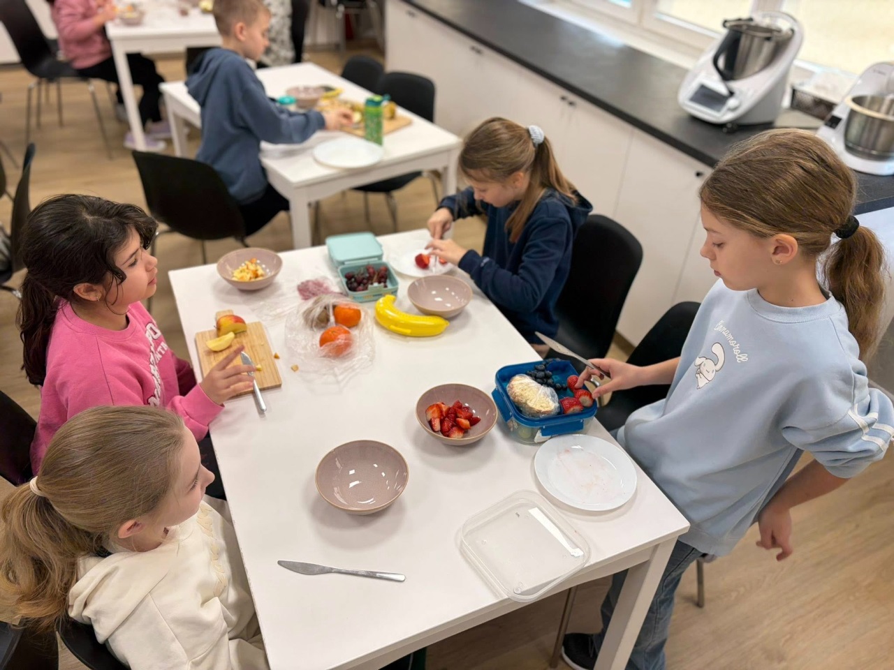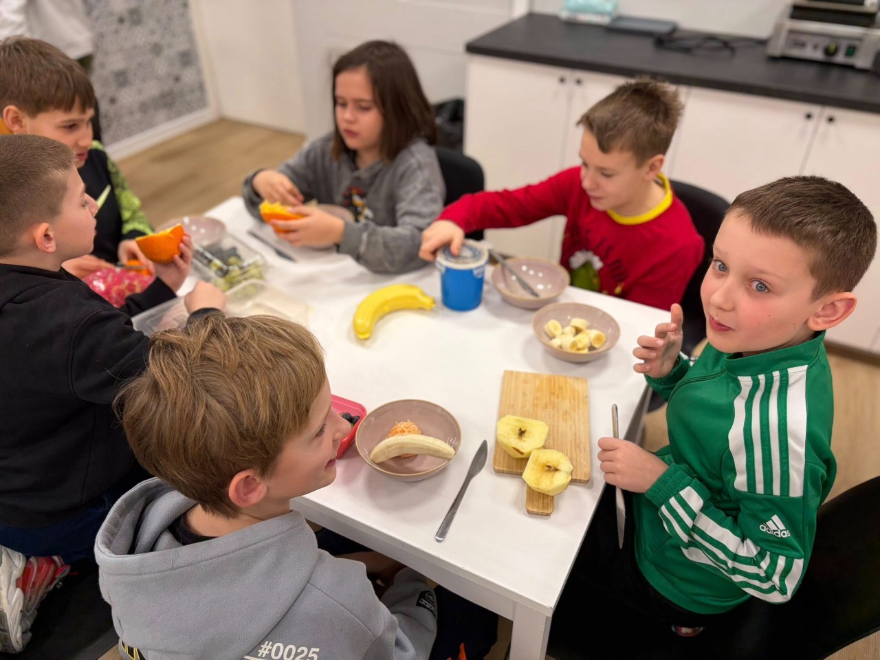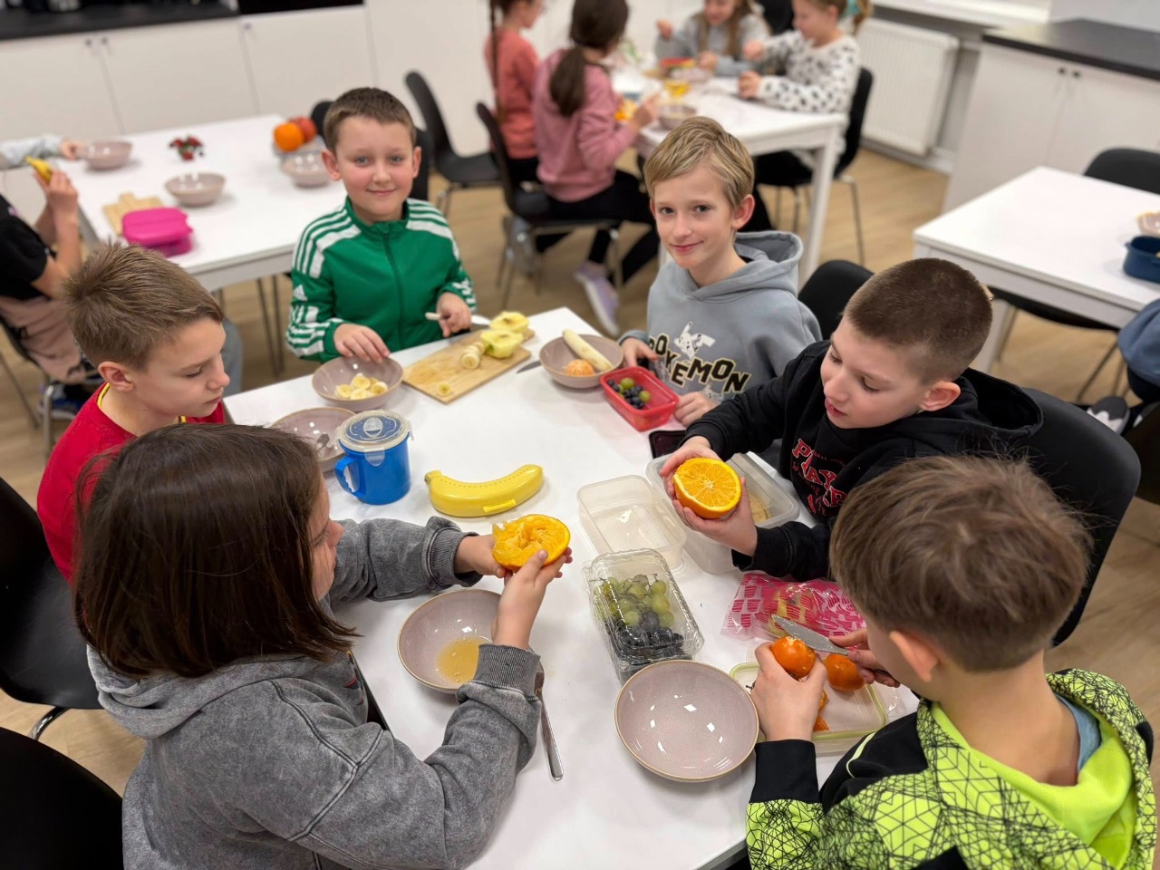 Uczniowie klasy 3b spędzili dzisiejszy poranek w pracowni kulinarnej. Na początku, podczas zajęć języka angielskiego, utrwalili nazwy owoców w języku angielskim oraz zaśpiewali piosenkę związaną z tym tematem.