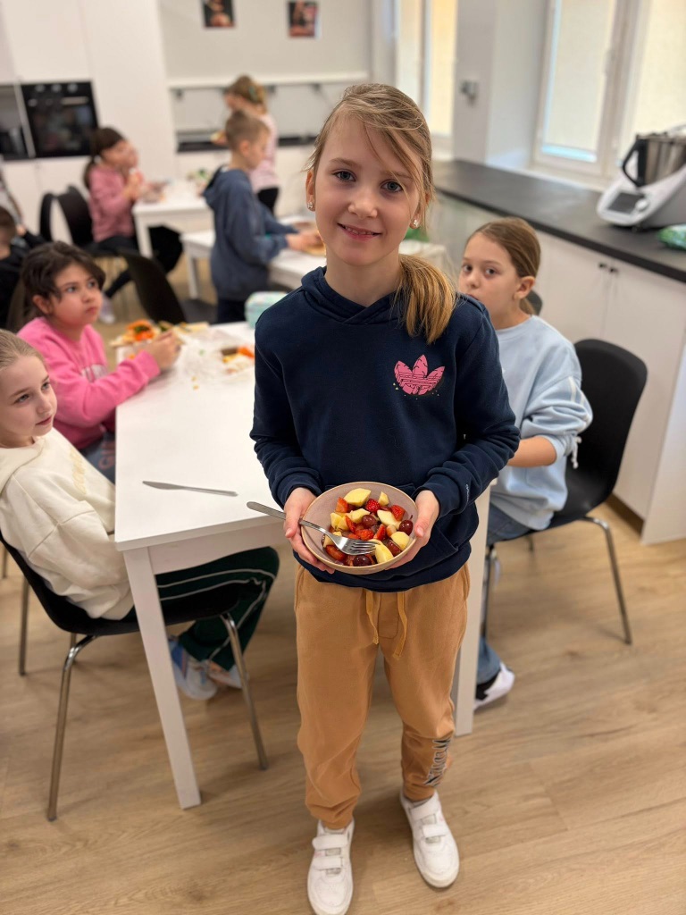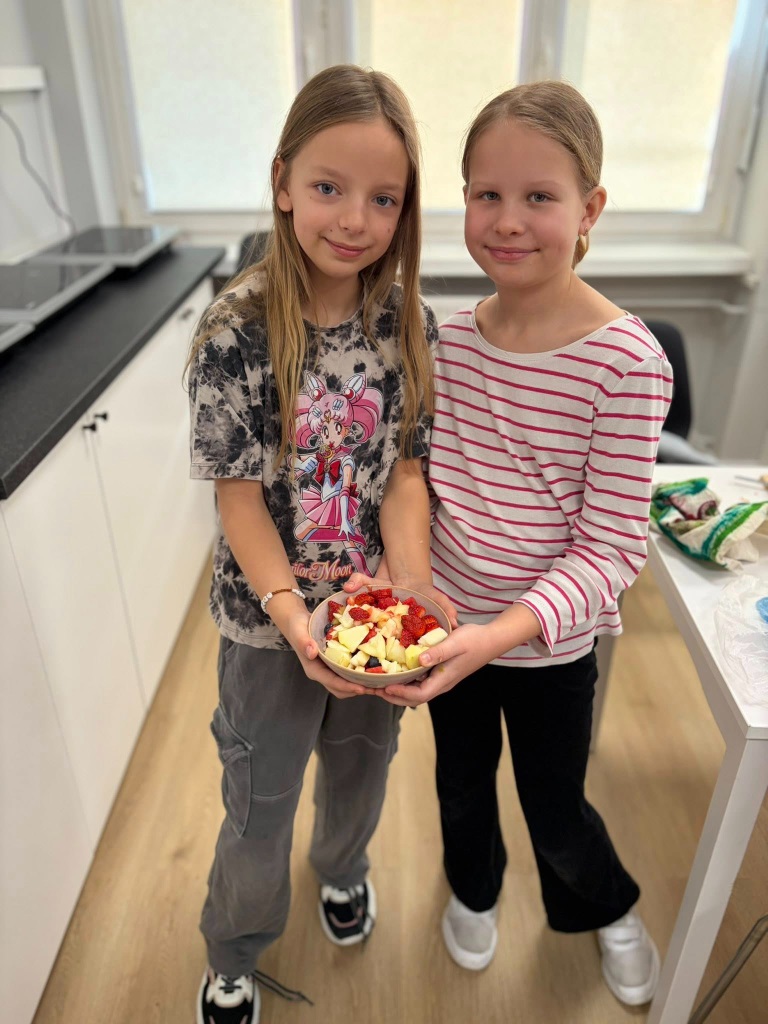 Następnie samodzielnie przygotowali pyszne sałatki owocowe z przyniesionych owoców. Była to świetna okazja do nauki języka angielskiego i utrwalenia poznanego słownictwa, a także do rozwijania samodzielności oraz umiejętności kulinarnych.