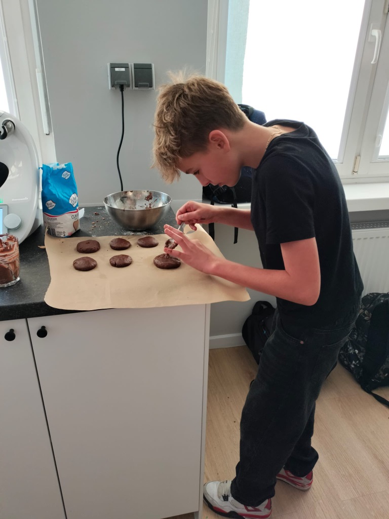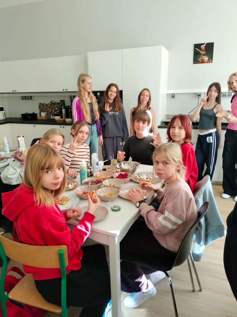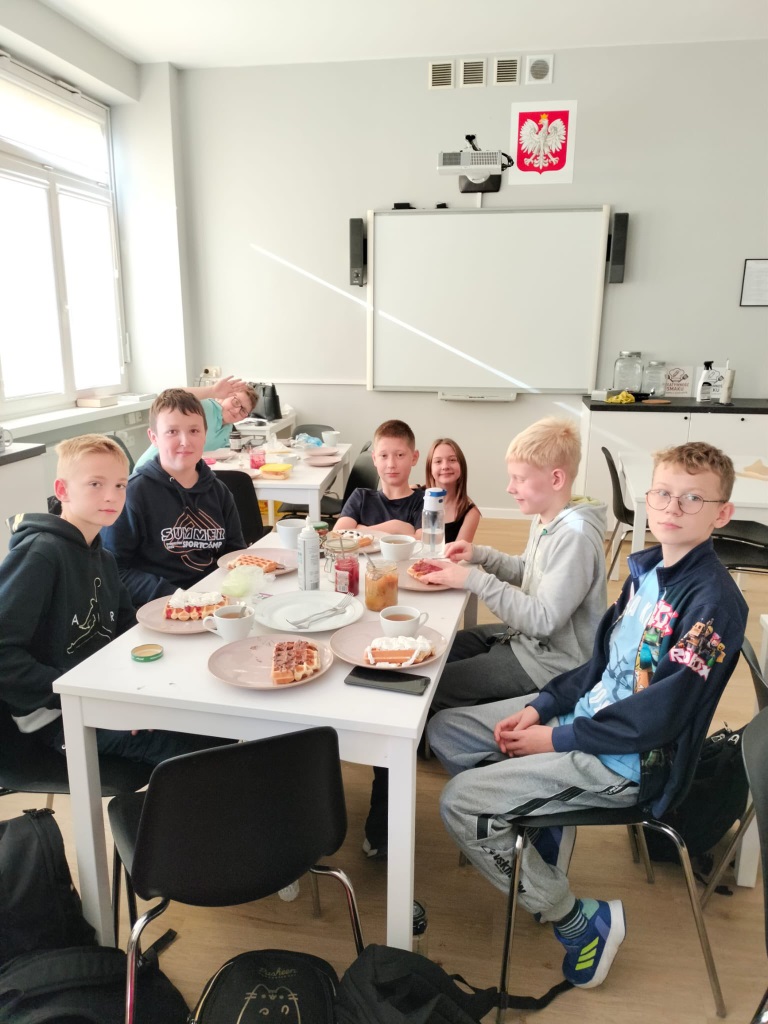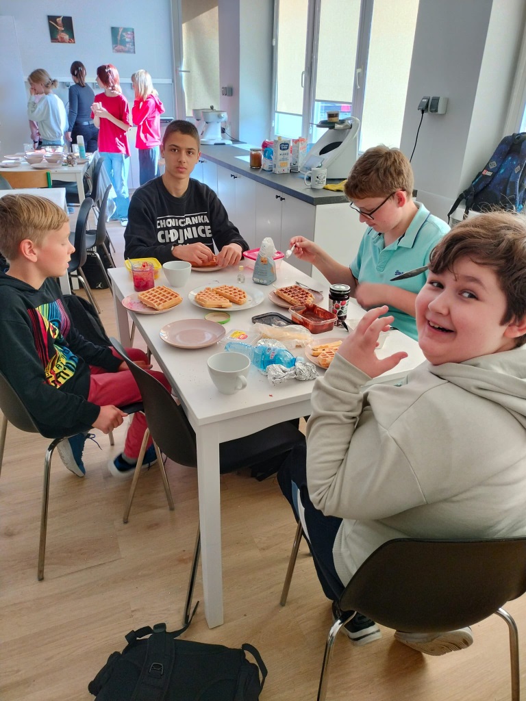Klasa 6b z wychowawcą w szkolnej pracowni kulinarnej. Wspólny czas był pracowity. Uczniowie wykazali się współpracą i kreatywnością podczas robienia gofrów, naleśników, ciasteczek czekoladowych i soków owocowych. Na pewno wkrótce powtórzymy tę aktywność.