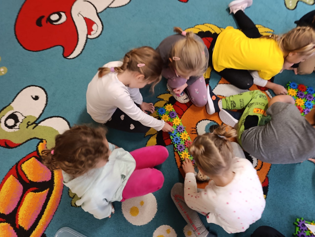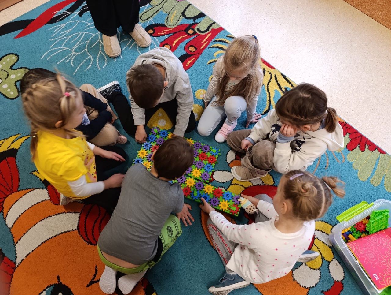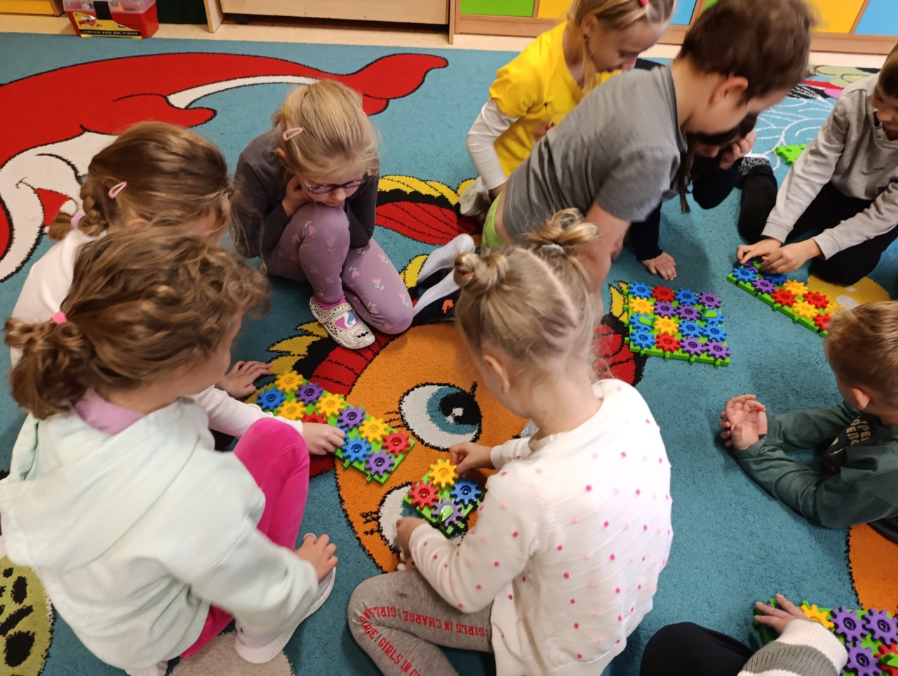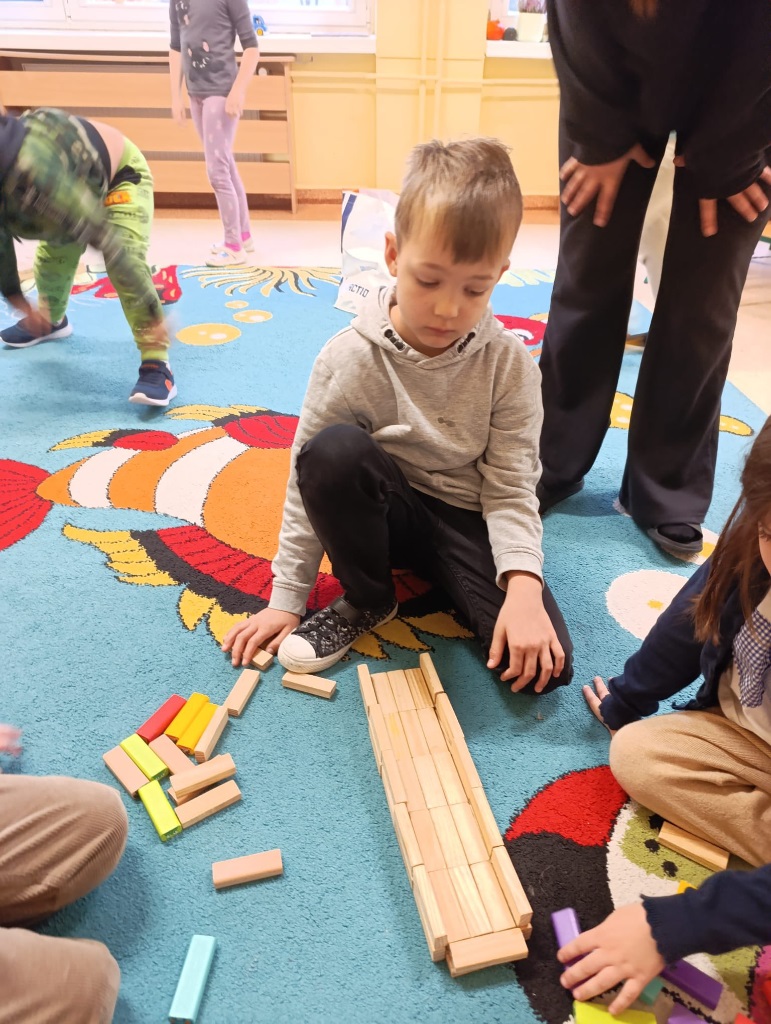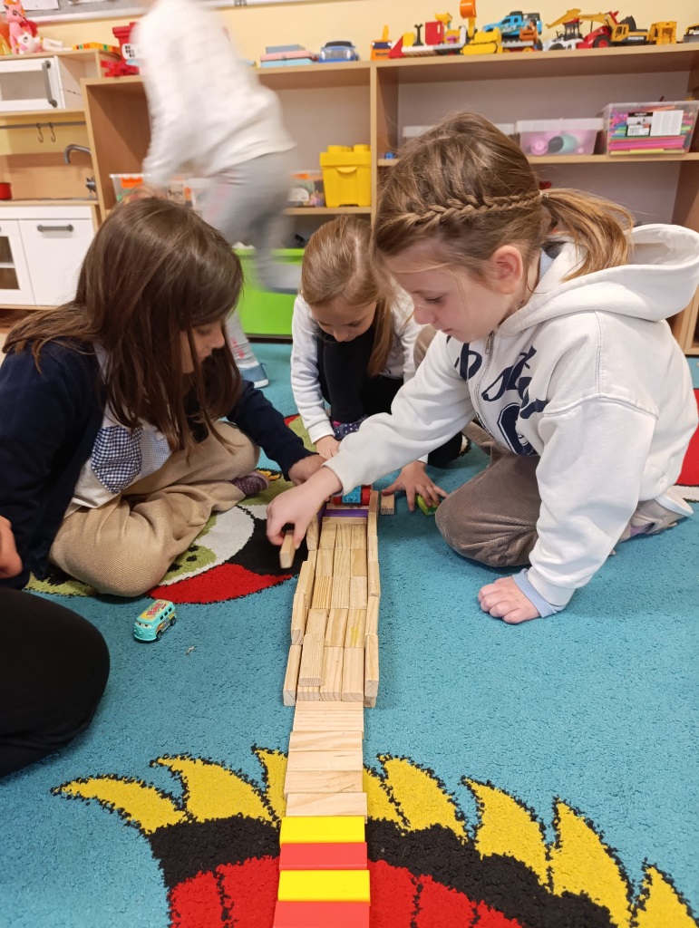 W drugiej części zajęć poznaliśmy nowe klocki KORBO. To początek naszej przygody z tym zestawem! Dzieci dowiedziały się, czym jest m.in. koło zębate, koło napędzające i korbka, a także obserwowały, jak elementy wprawiają się w ruch.