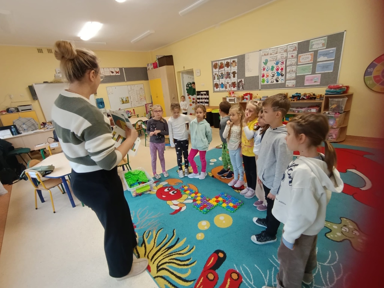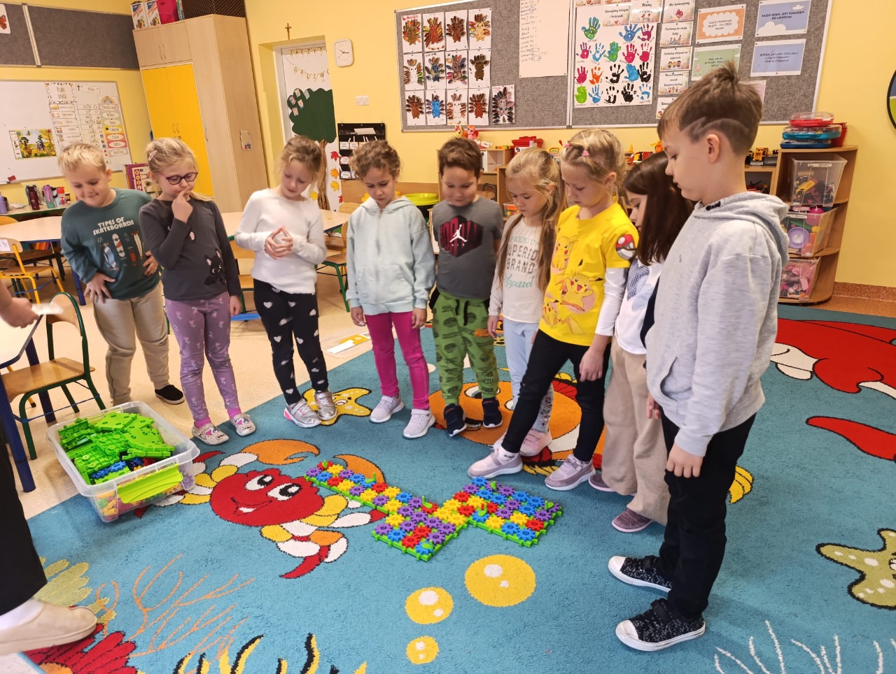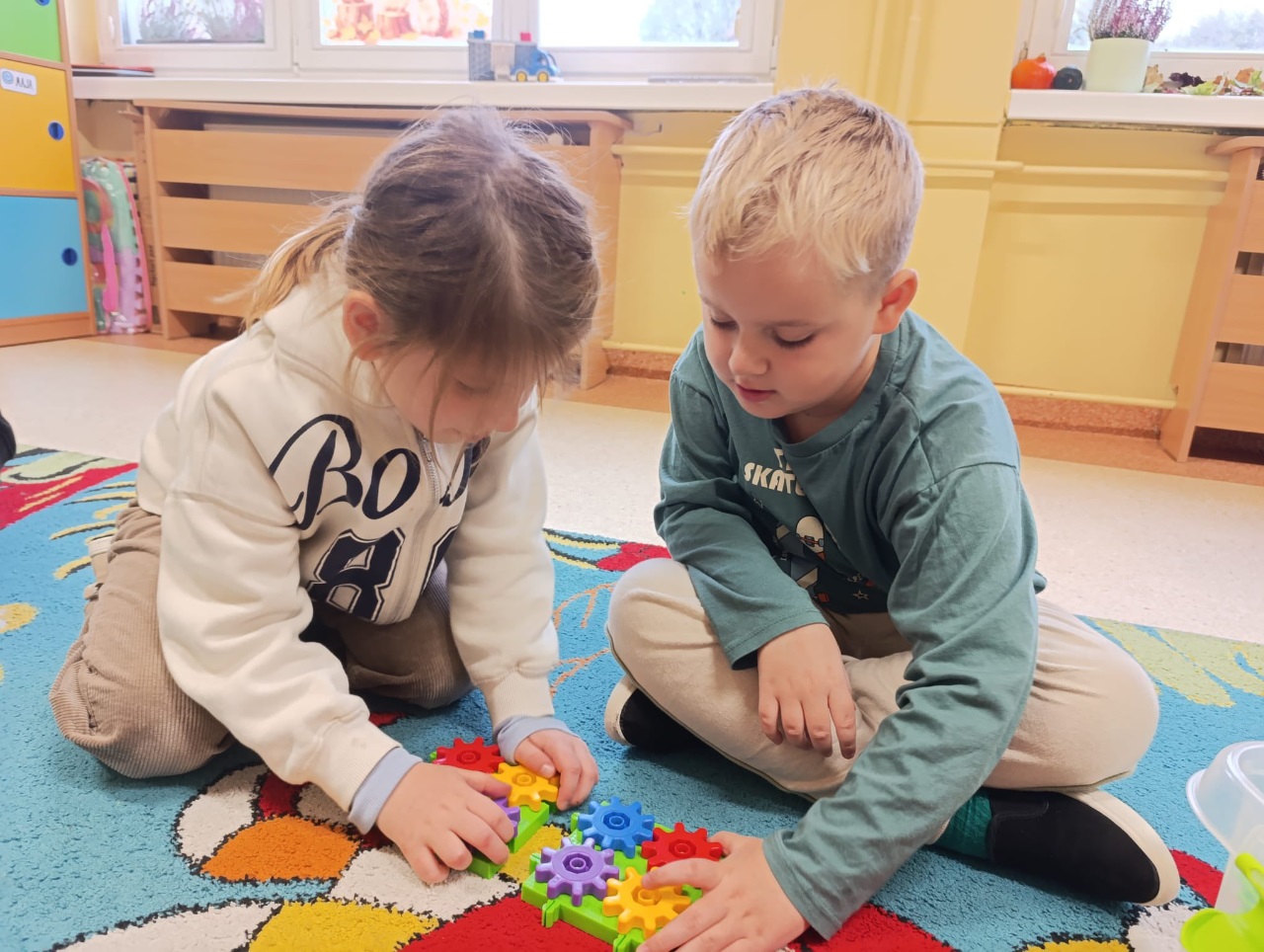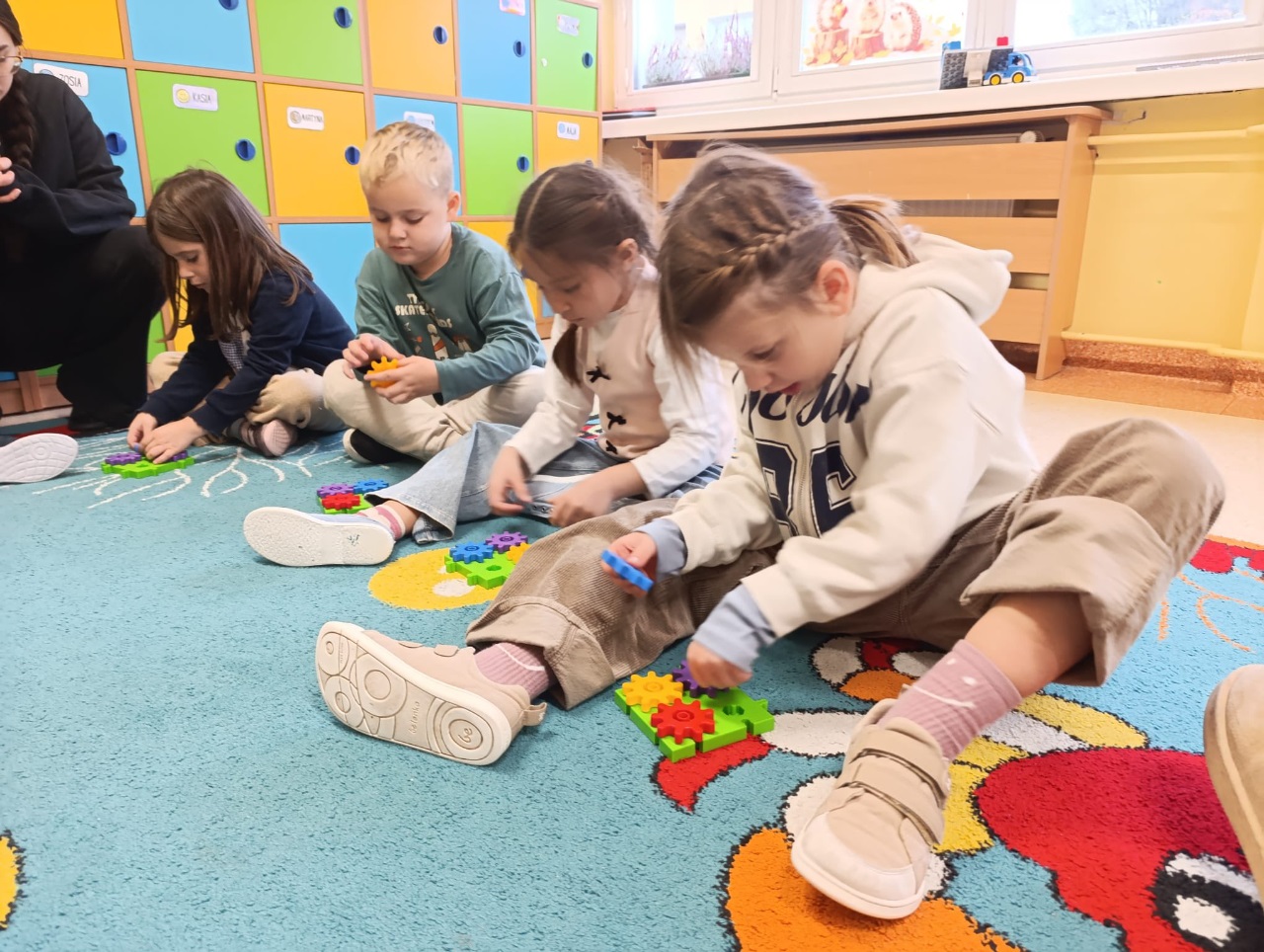 W drugiej części zajęć poznaliśmy nowe klocki KORBO. To początek naszej przygody z tym zestawem! Dzieci dowiedziały się, czym jest m.in. koło zębate, koło napędzające i korbka, a także obserwowały, jak elementy wprawiają się w ruch.