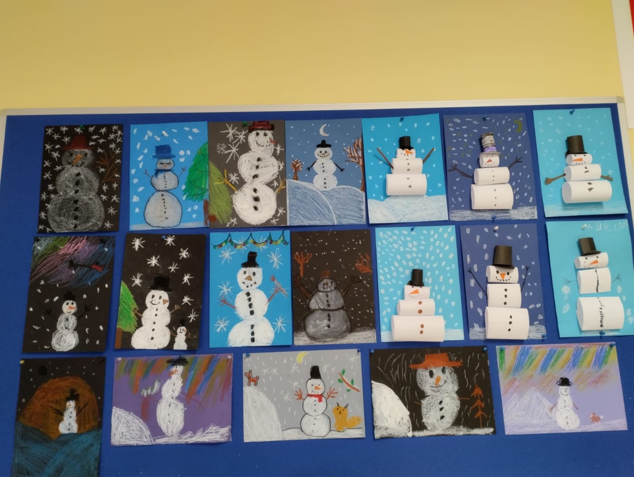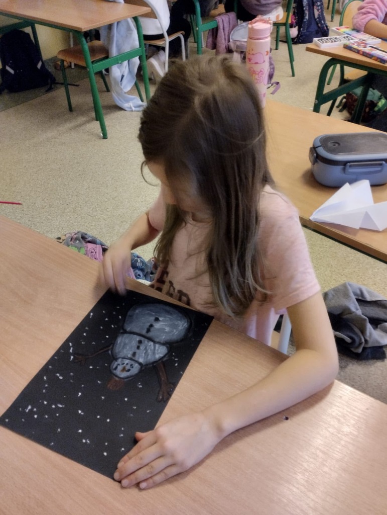 Bałwan uważany jest za jednego z najważniejszych symboli zimy. Dzieci w świetlicy szkolnej wykonały za pomocą kredek, farb i pasteli "galerię bałwanków".
