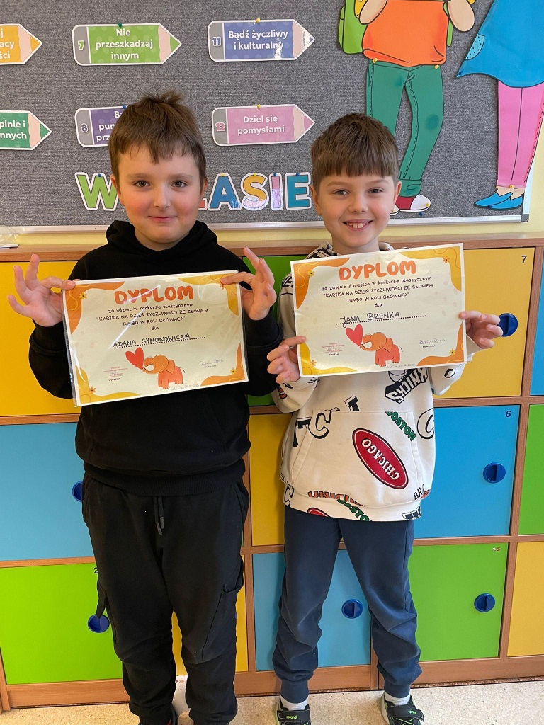Gratulacje dla chłopców za udział w konkursie plastycznym „Słonik Tumbo pomaga”.