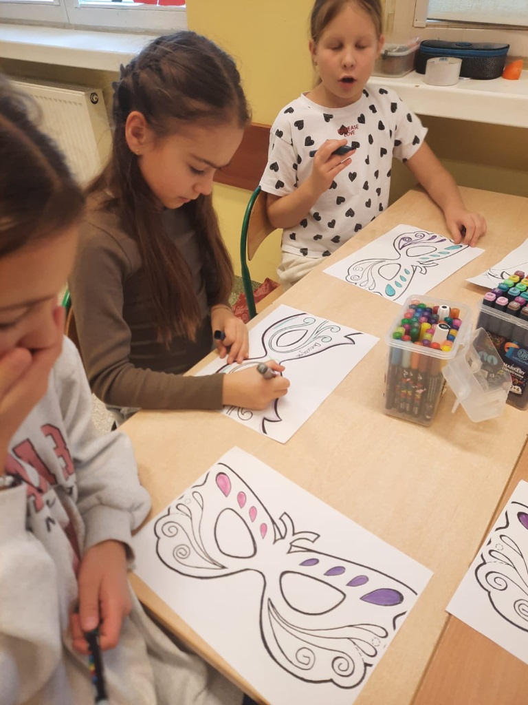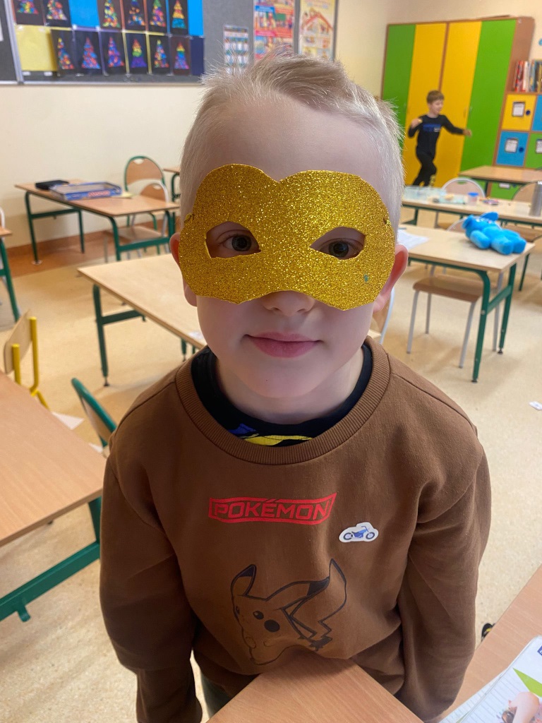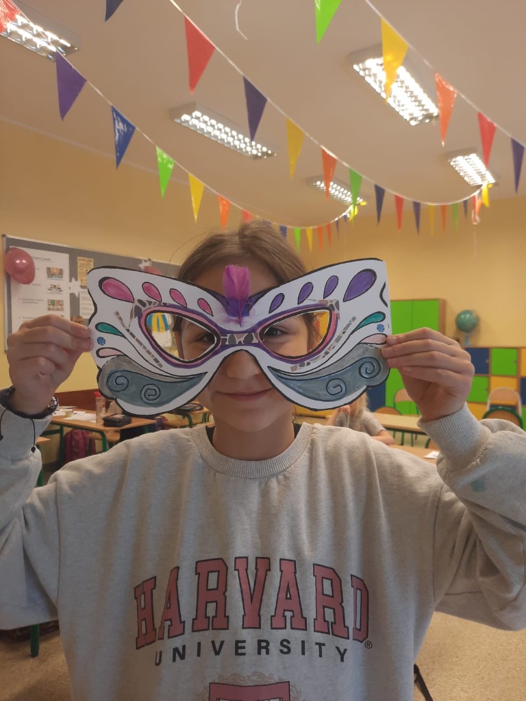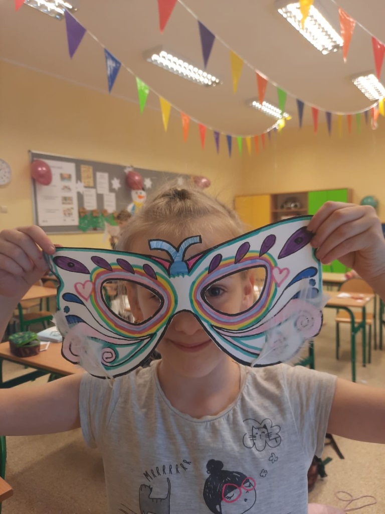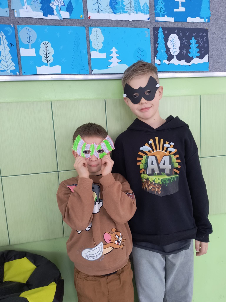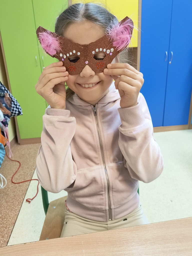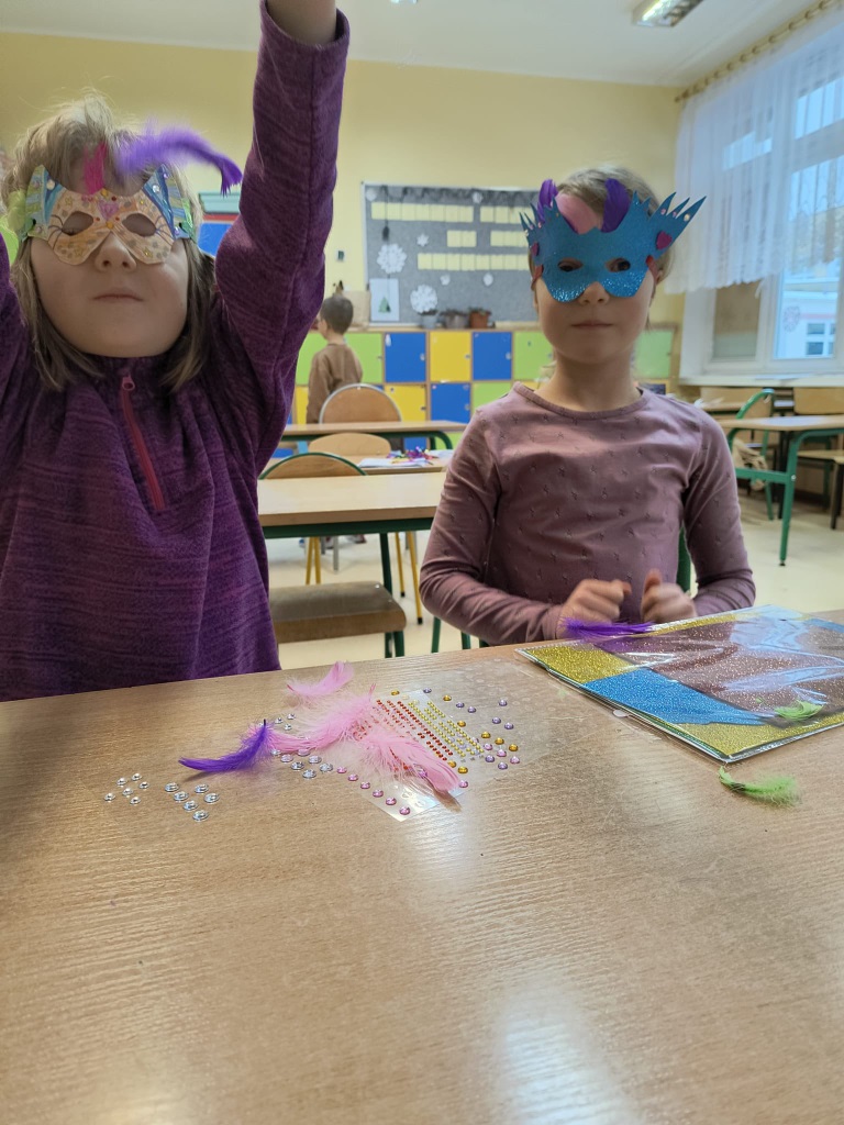 W świetlicy szkolnej także trwa karnawał. Dzieci wykonały maski dowolną techniką, ozdabiając je przeróżnymi materiałami tj. brokat, piórka, czy cekiny.