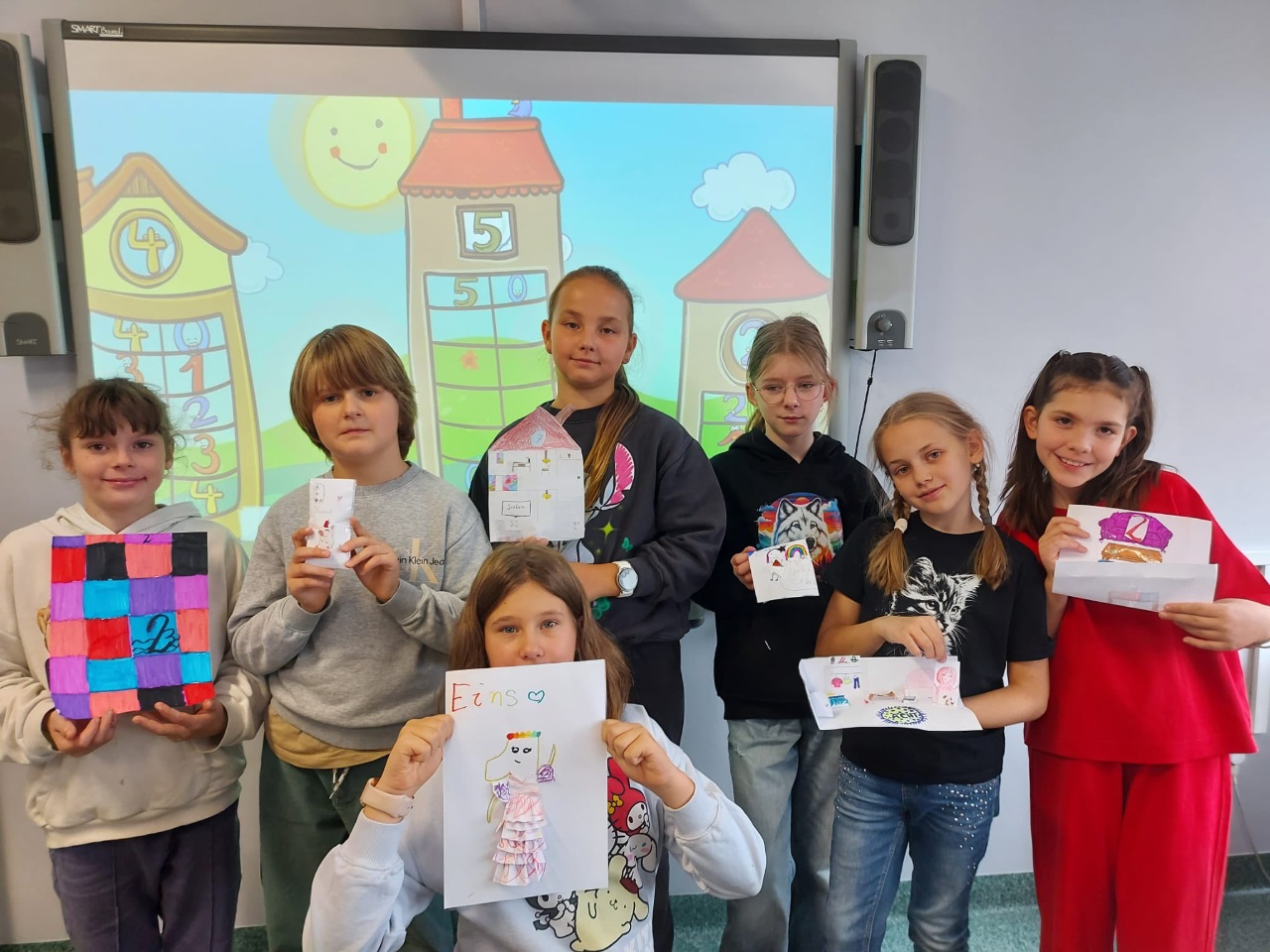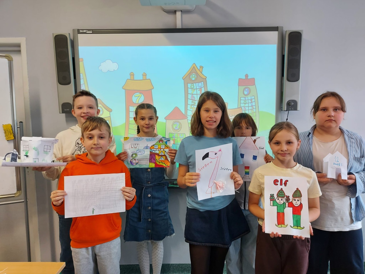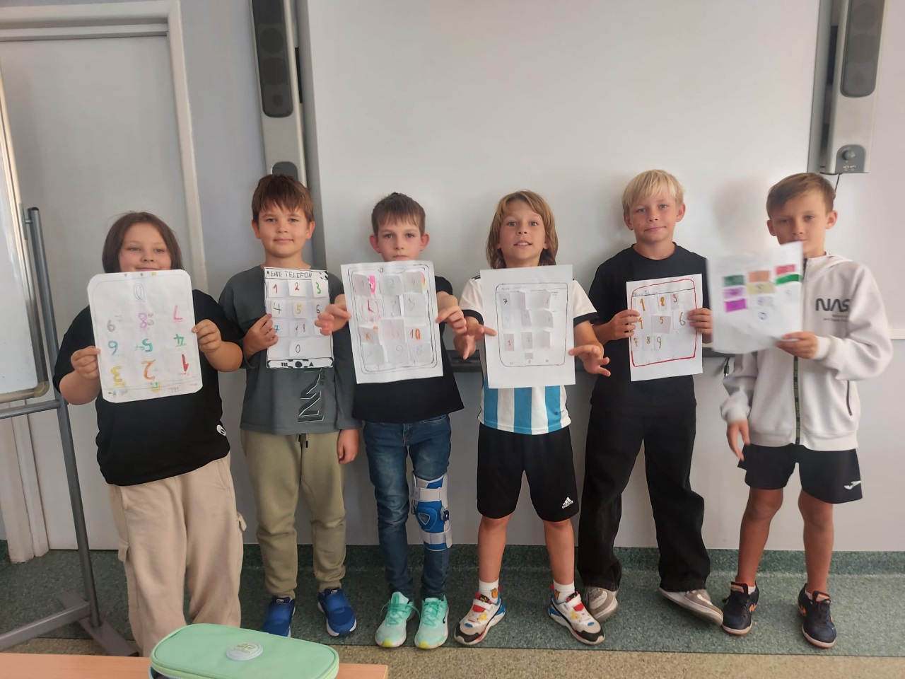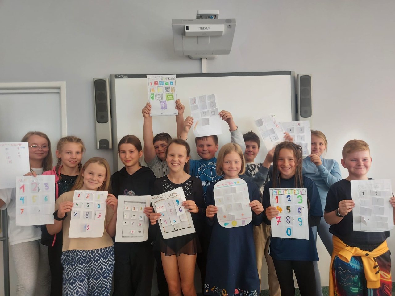 Na języku niemieckim dzieci z klas czwartych wykonywały "Zahlenhäuser - Domki liczbowe". To nie tylko zabawa logicznego myślenia, ale i kreatywnej matematyki. Druga grupa dzieci stworzyła przestrzenne modele klawiatury telefonu zawierającej wymyślone przez dzieci cechy każdej z liczb. ![]()