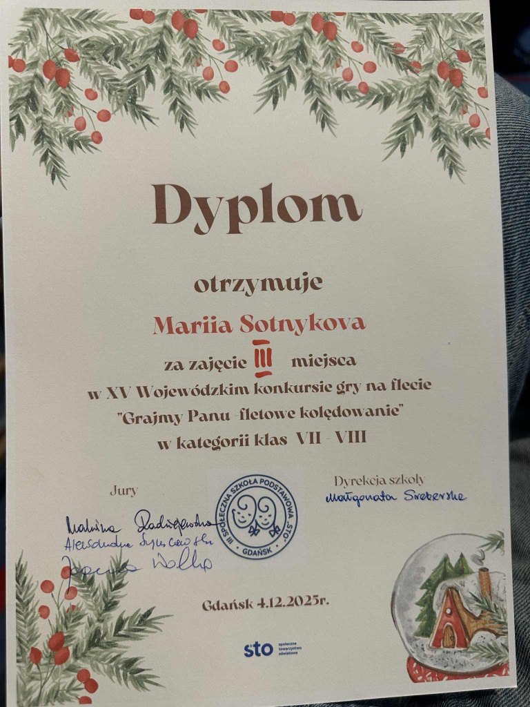 Nasza uczennica Mariia Sotnykova z klasy 7a reprezentowała dzisiaj naszą szkołę w XV Wojewódzkim konkursie gry na flecie "Grajmy Panu - fletowe kolędowanie" i zajęła III miejsce Serdecznie gratulujemy i życzymy dalszych sukcesów