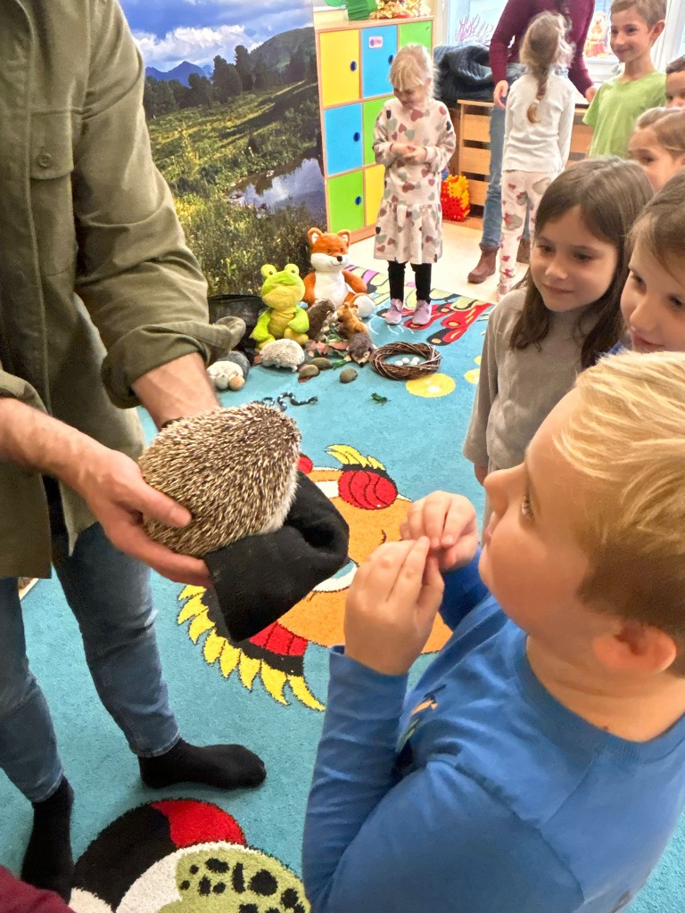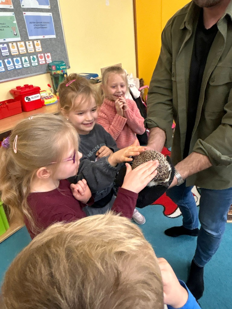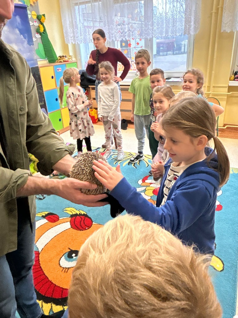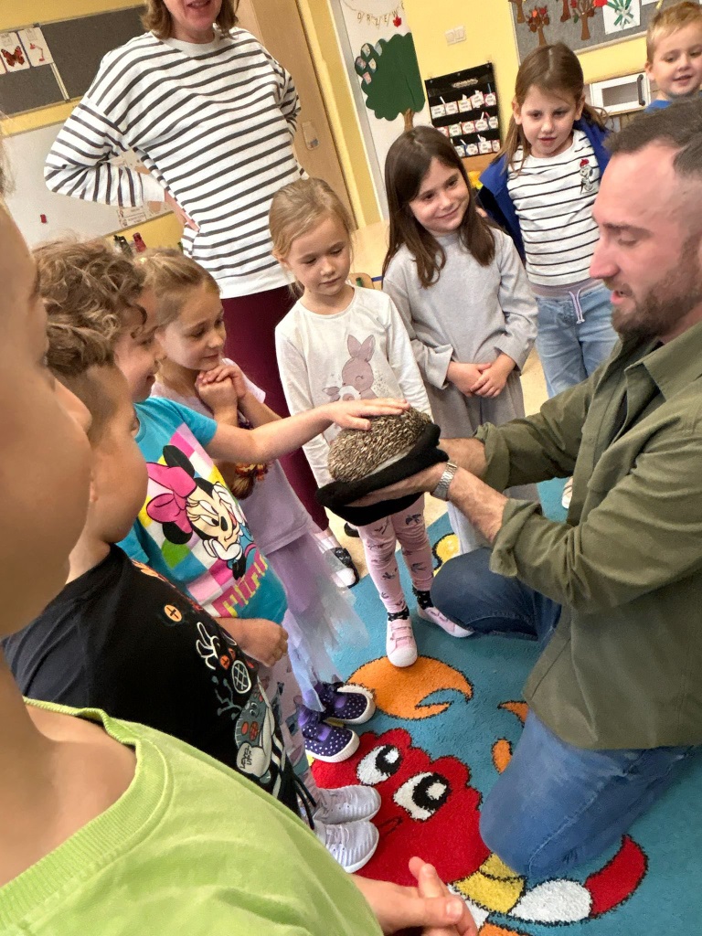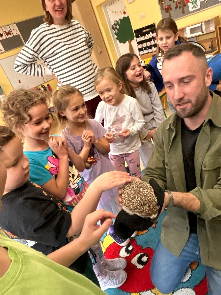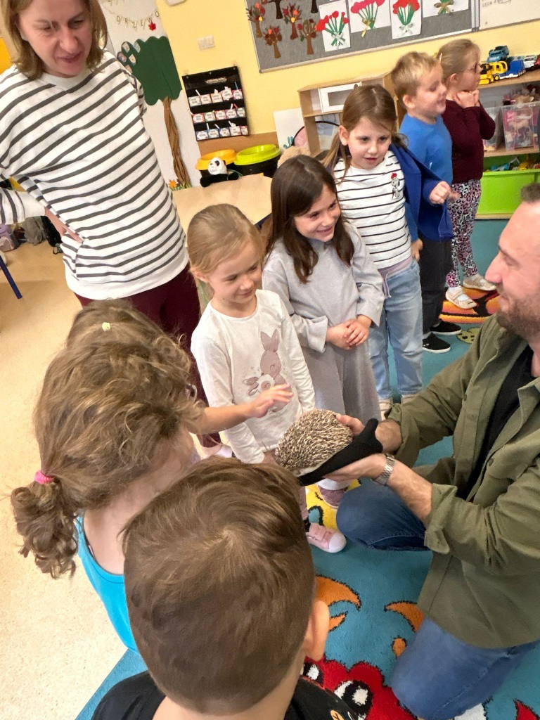 Odwiedziny jeża w zerówce. Dzieci poznały kulisy życia jeża oraz dowiedziały się wielu interesujących faktów na temat tych zwierzątek. Na koniec zajęć każdy mógł dotknąć i pogłaskać Jeżynkę