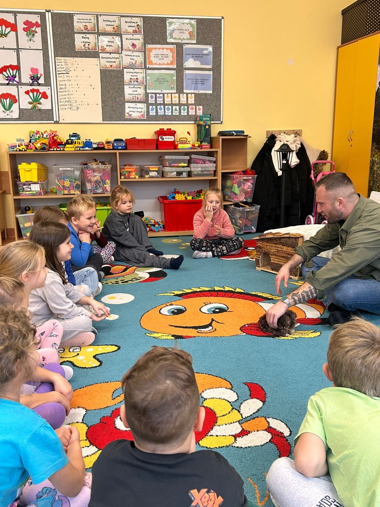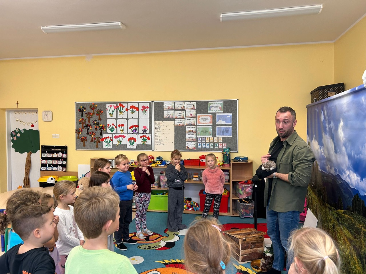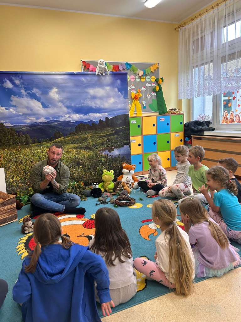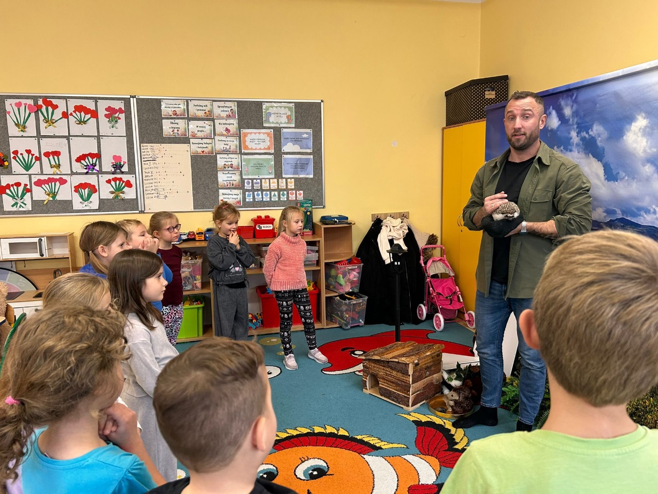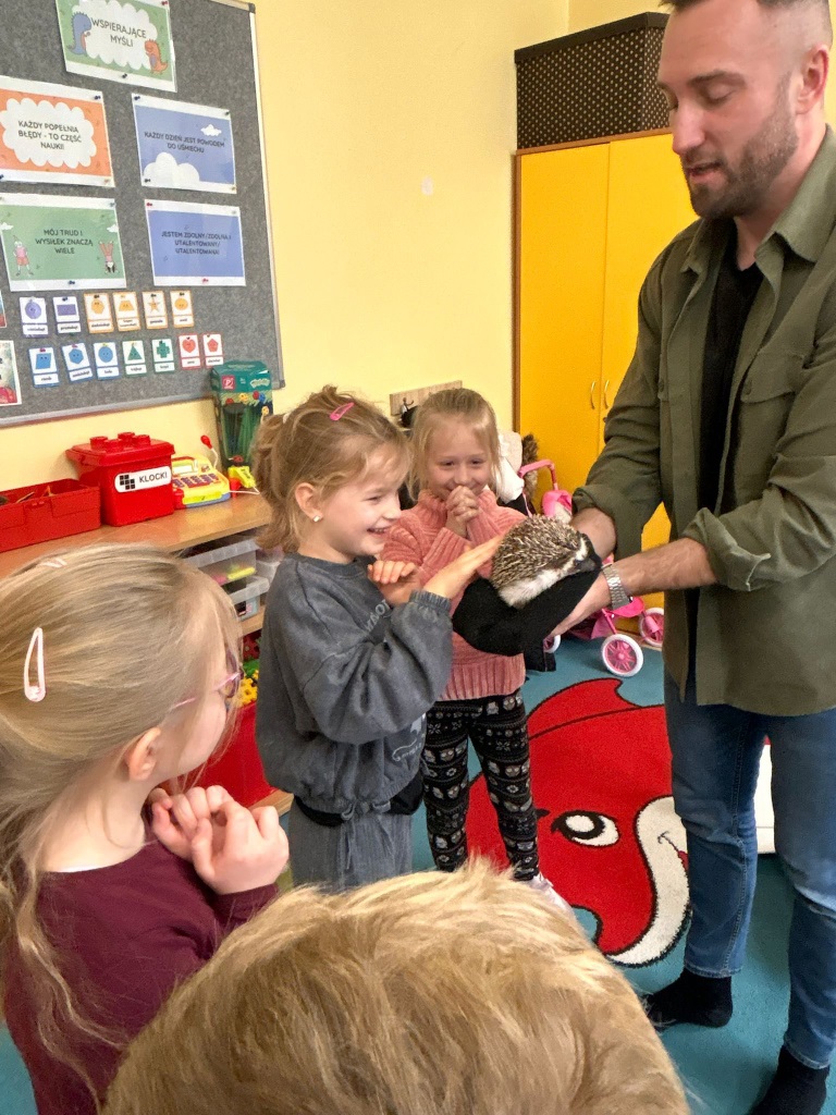 Odwiedziny jeża w zerówce. Dzieci poznały kulisy życia jeża oraz dowiedziały się wielu interesujących faktów na temat tych zwierzątek. Na koniec zajęć każdy mógł dotknąć i pogłaskać Jeżynkę
