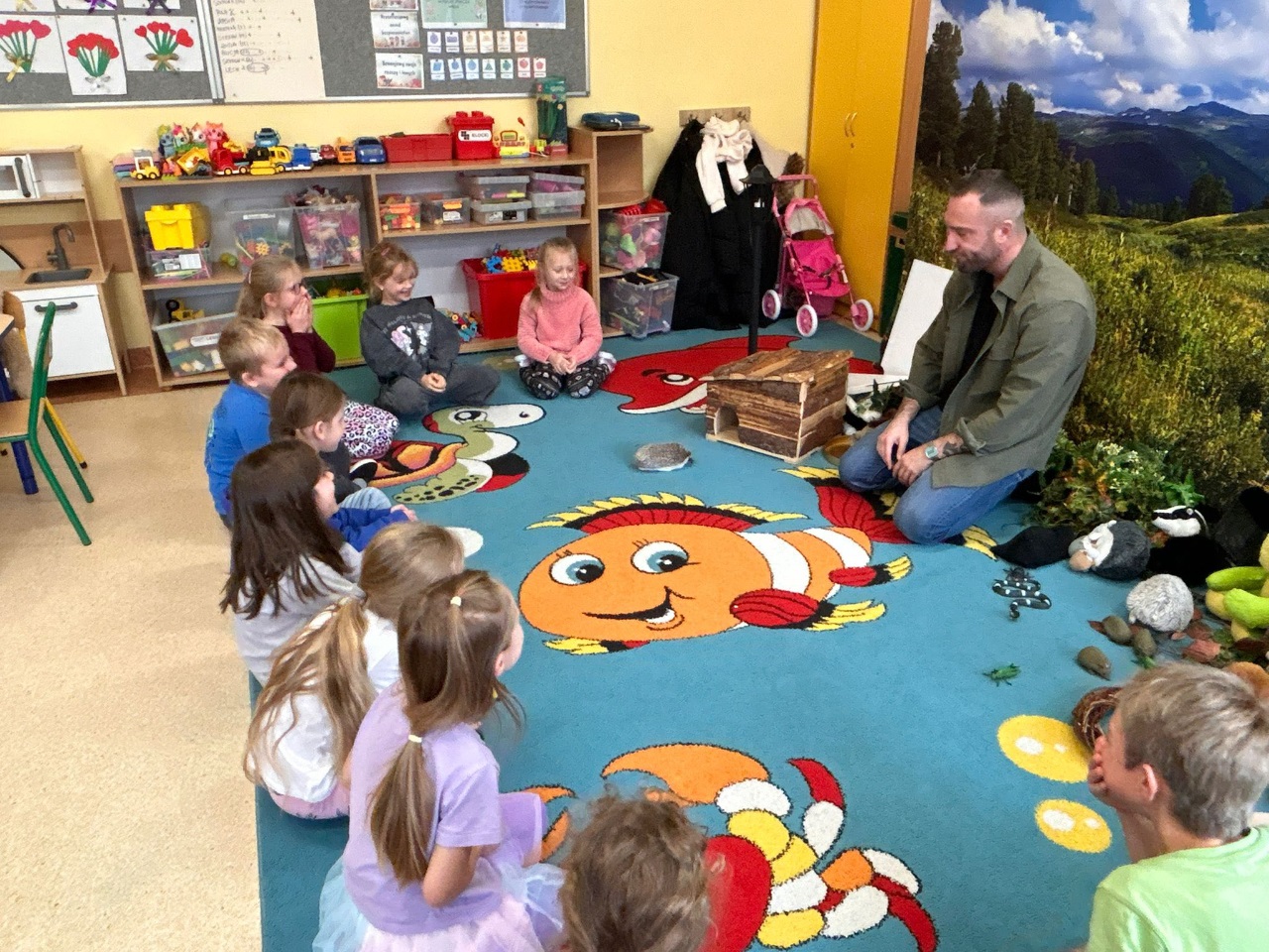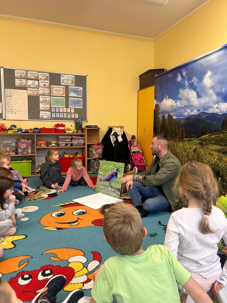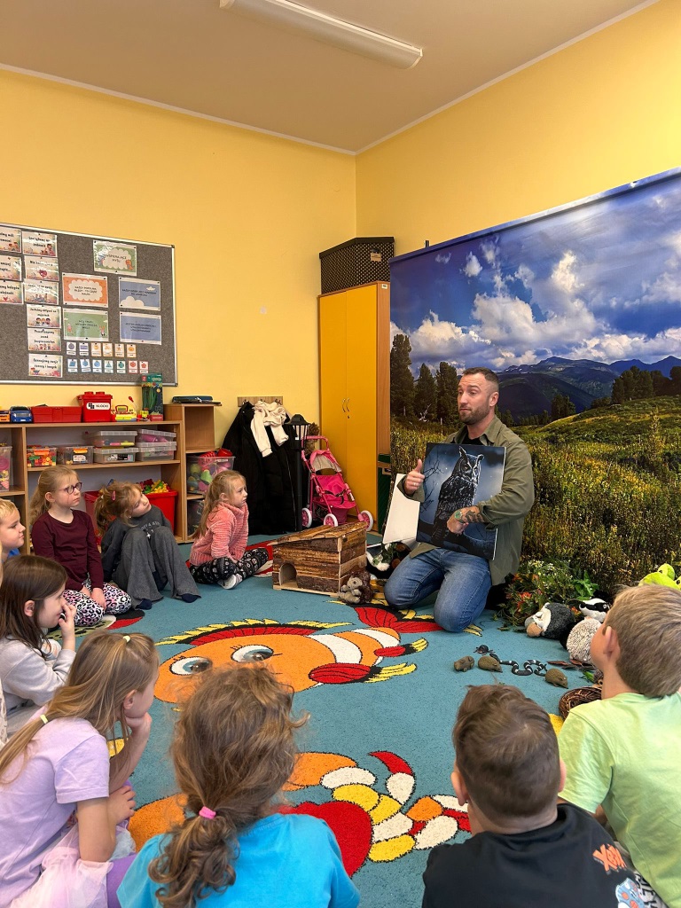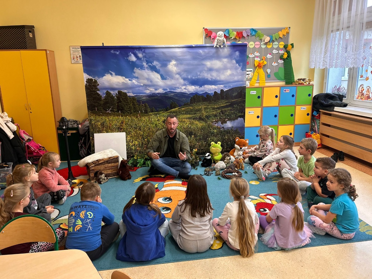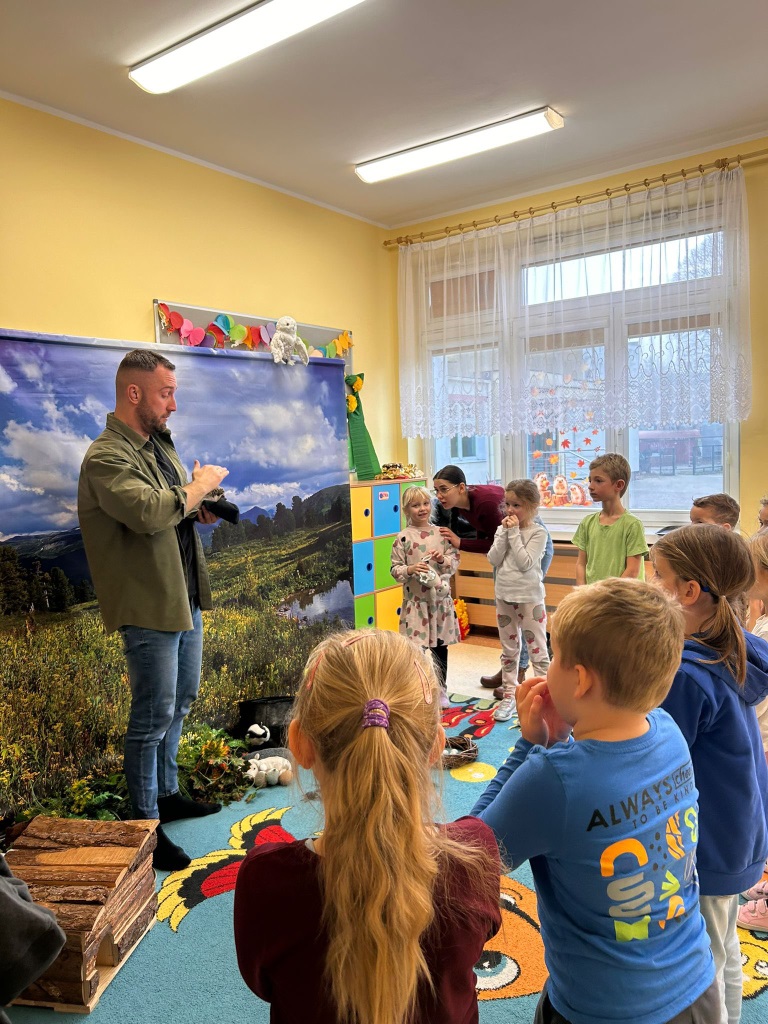 Odwiedziny jeża w zerówce. Dzieci poznały kulisy życia jeża oraz dowiedziały się wielu interesujących faktów na temat tych zwierzątek. Na koniec zajęć każdy mógł dotknąć i pogłaskać Jeżynkę