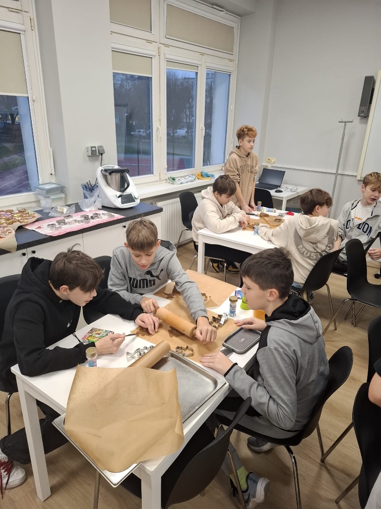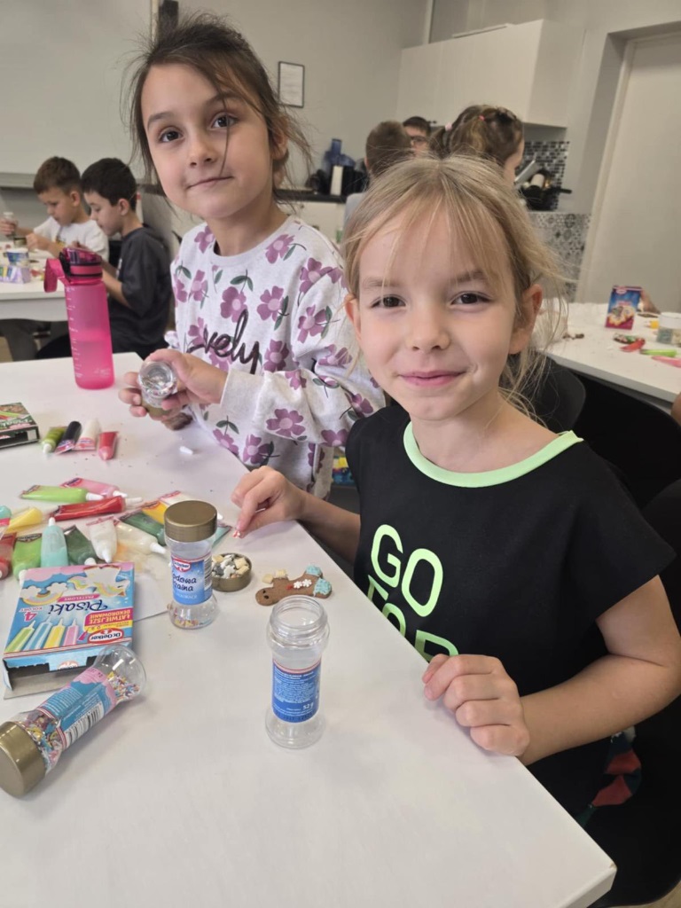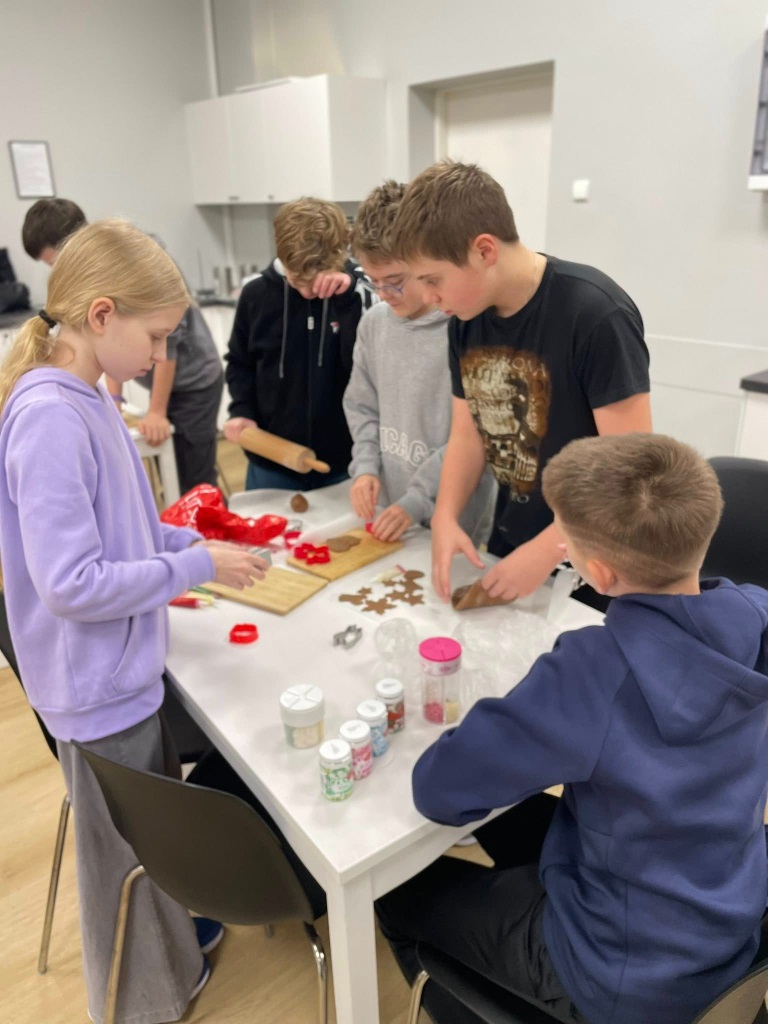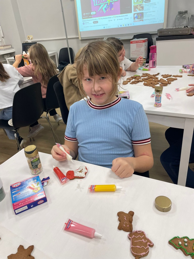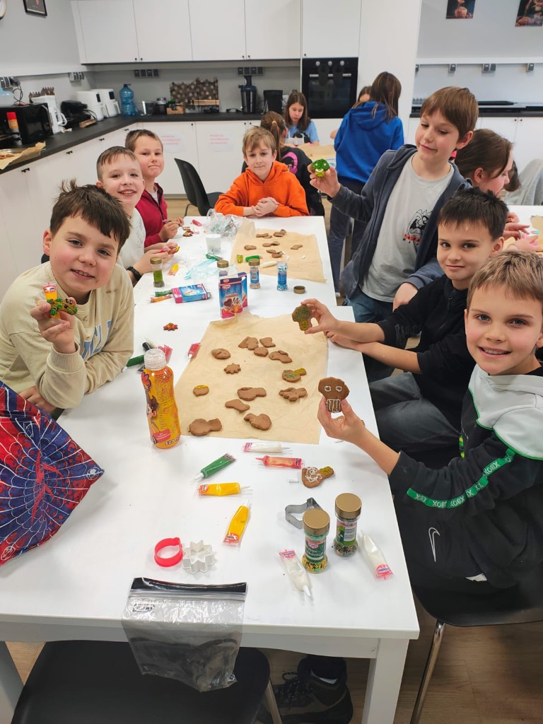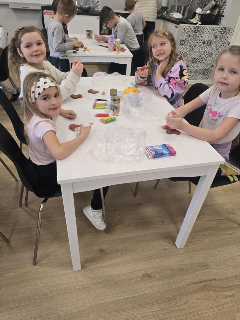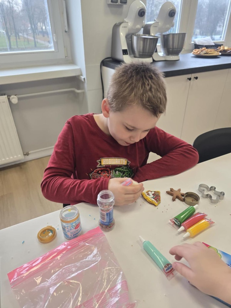 Uczniowie klasy 3a z zaangażowaniem piekli i ozdabiali pierniki, przygotowując je na świąteczny kiermasz szkolny. Wspólna praca, zapach korzennych przypraw i kreatywne dekoracje wprowadziły wszystkich w magiczny, przedświąteczny nastrój.