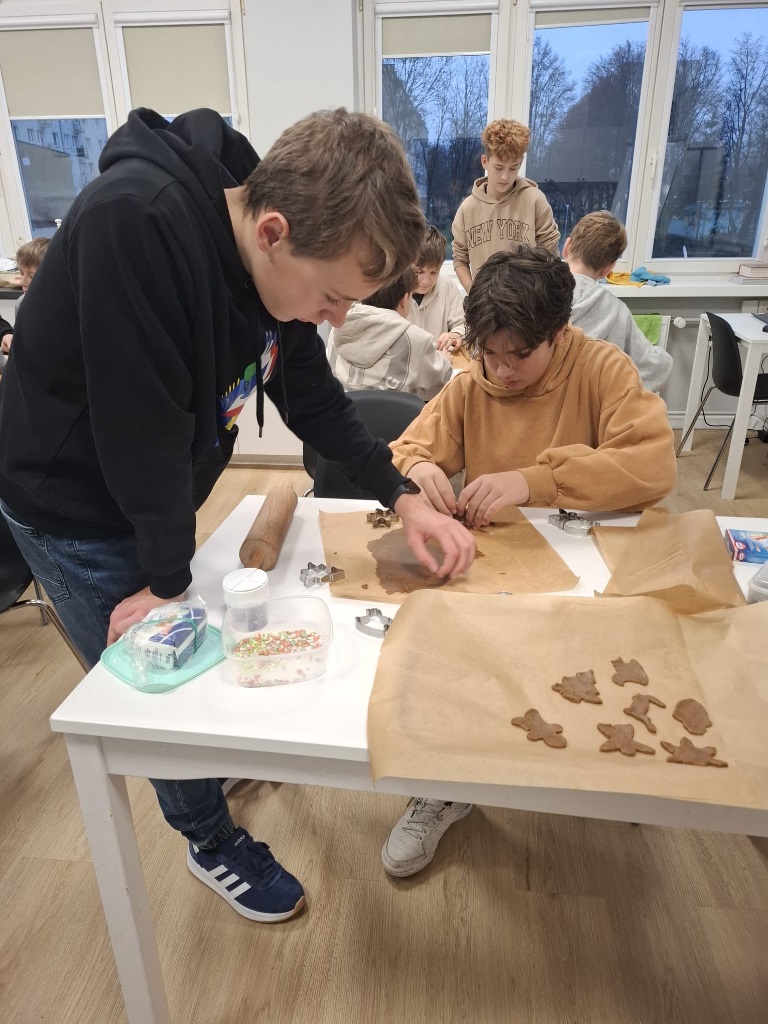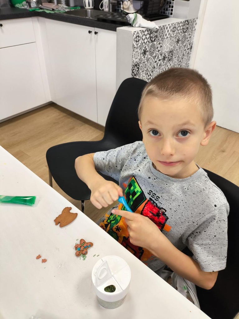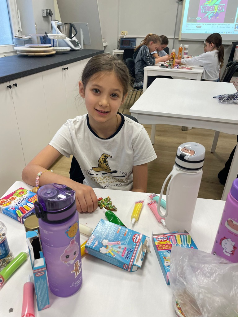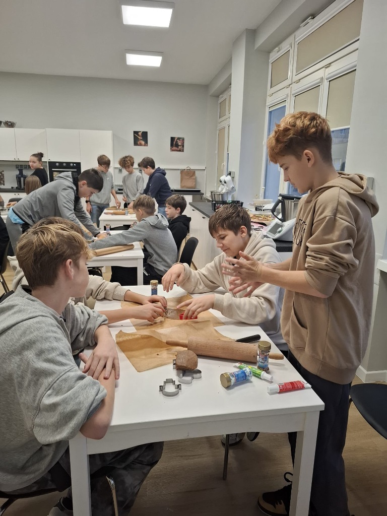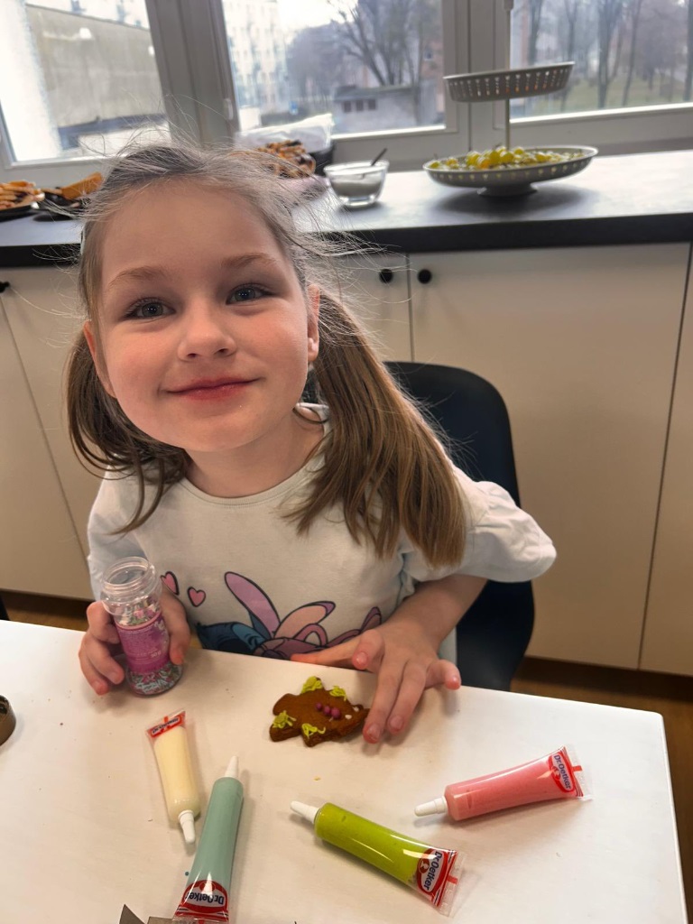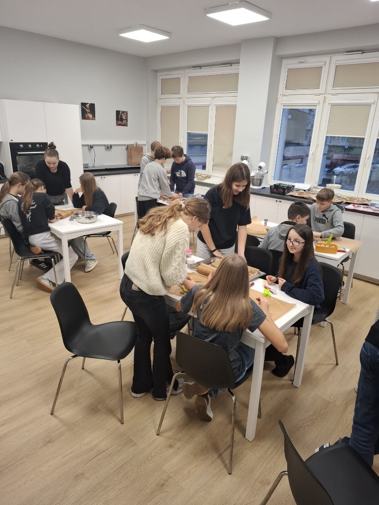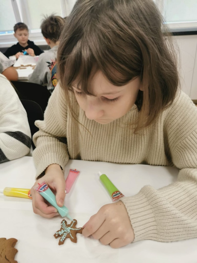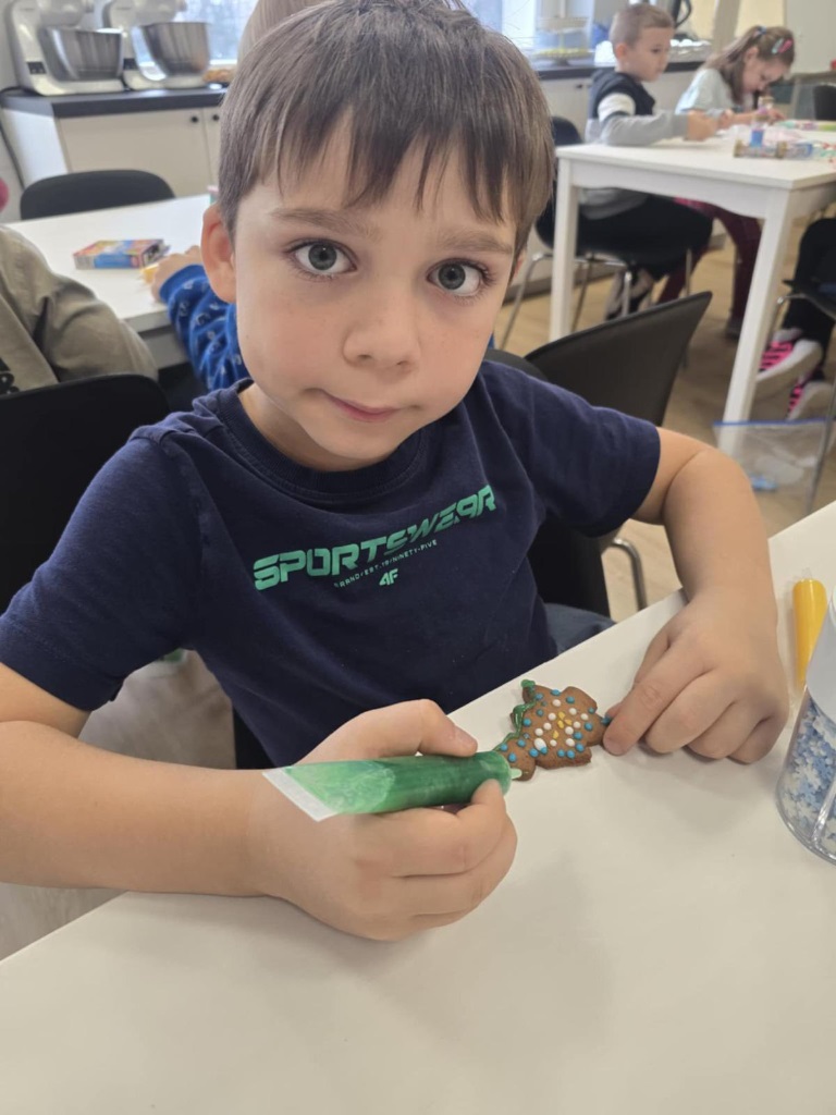 Uczniowie klasy 3a z zaangażowaniem piekli i ozdabiali pierniki, przygotowując je na świąteczny kiermasz szkolny. Wspólna praca, zapach korzennych przypraw i kreatywne dekoracje wprowadziły wszystkich w magiczny, przedświąteczny nastrój.