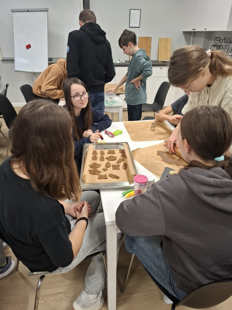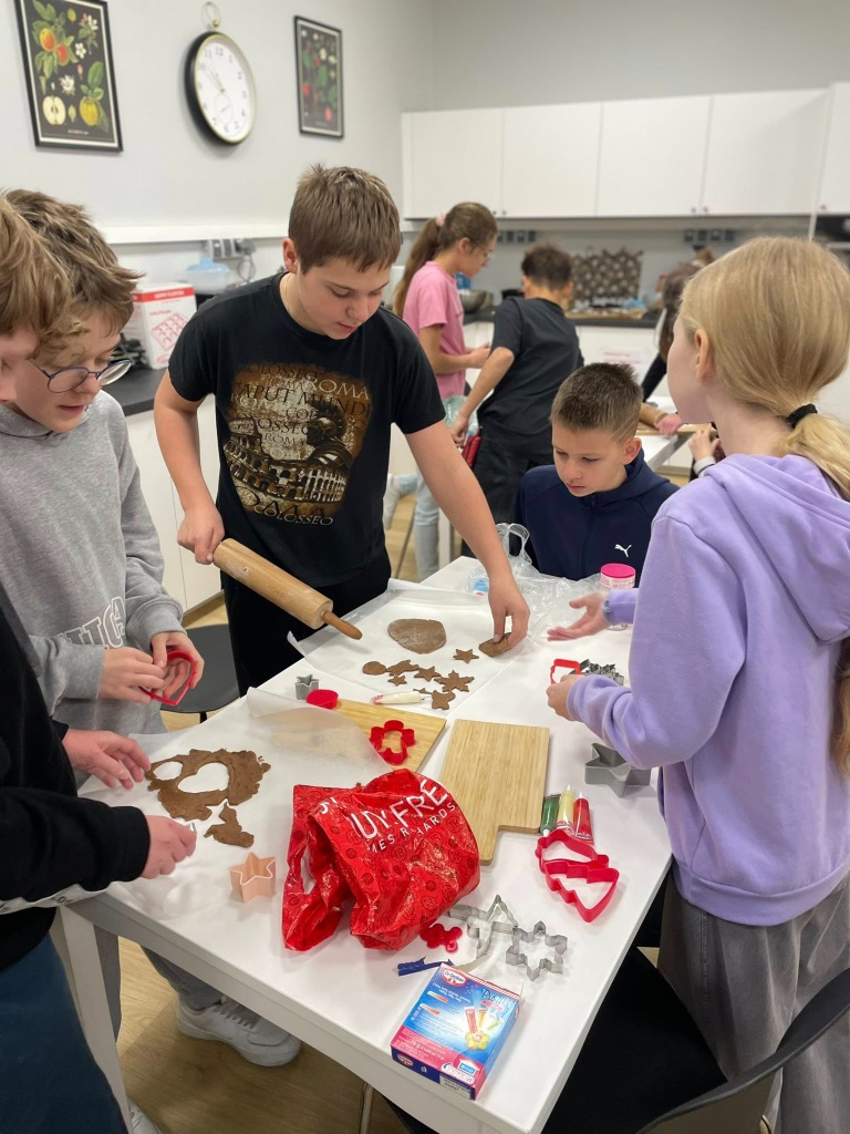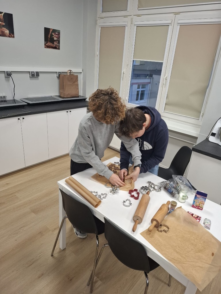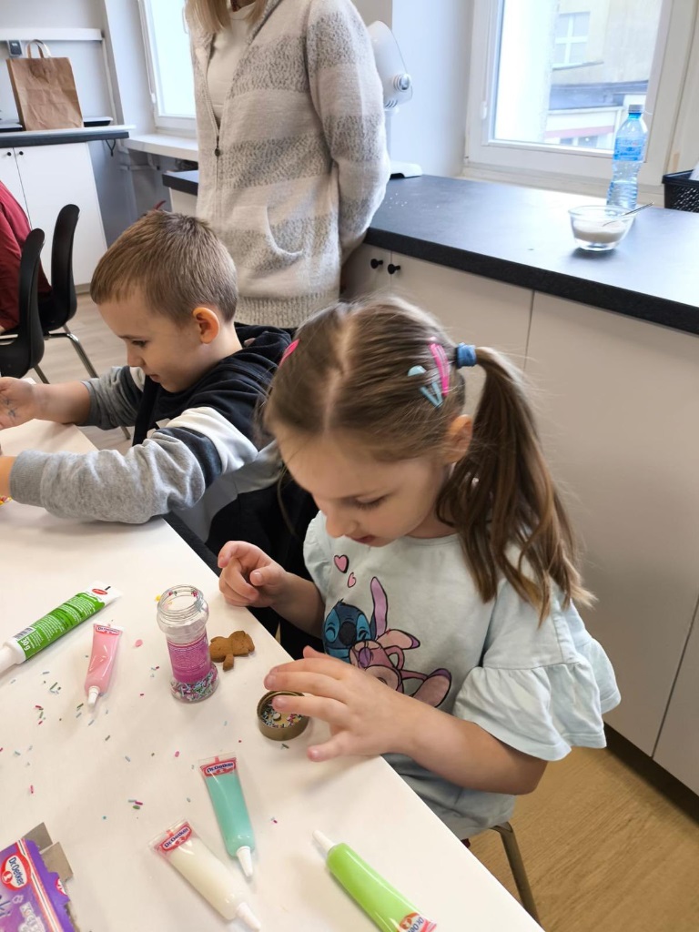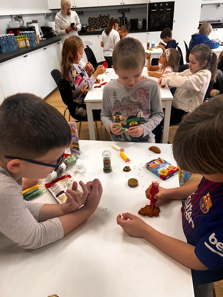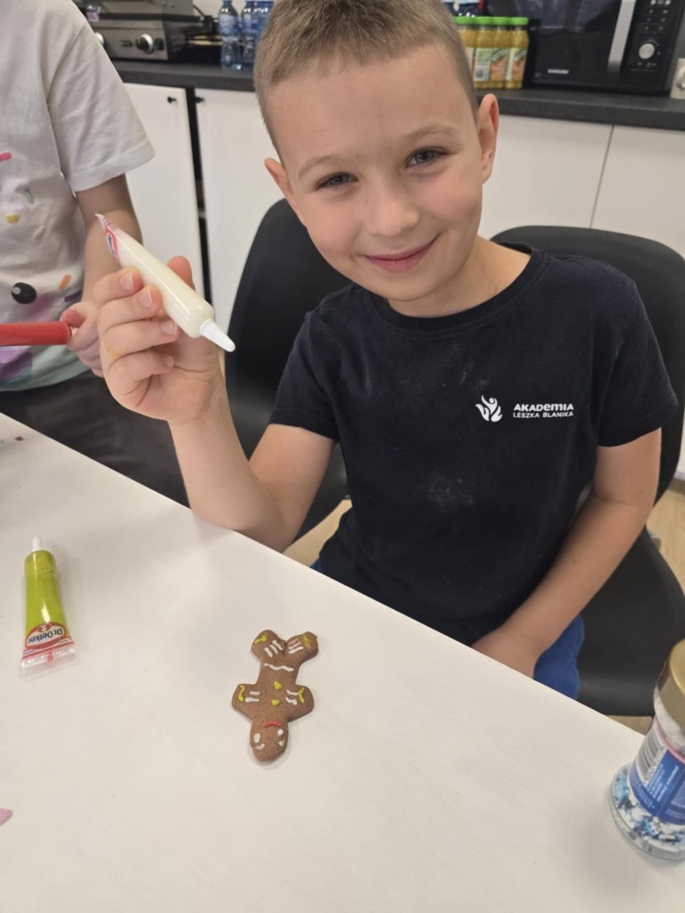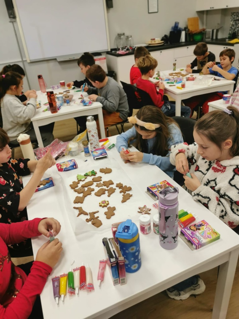 Uczniowie klasy 3a z zaangażowaniem piekli i ozdabiali pierniki, przygotowując je na świąteczny kiermasz szkolny. Wspólna praca, zapach korzennych przypraw i kreatywne dekoracje wprowadziły wszystkich w magiczny, przedświąteczny nastrój.