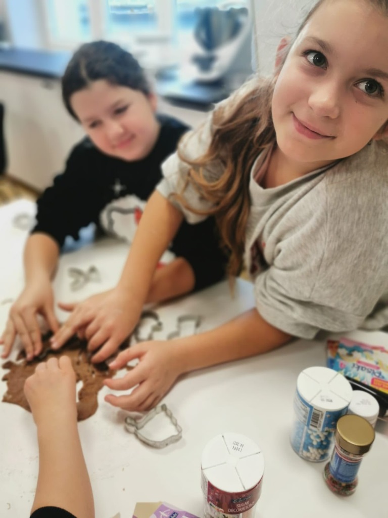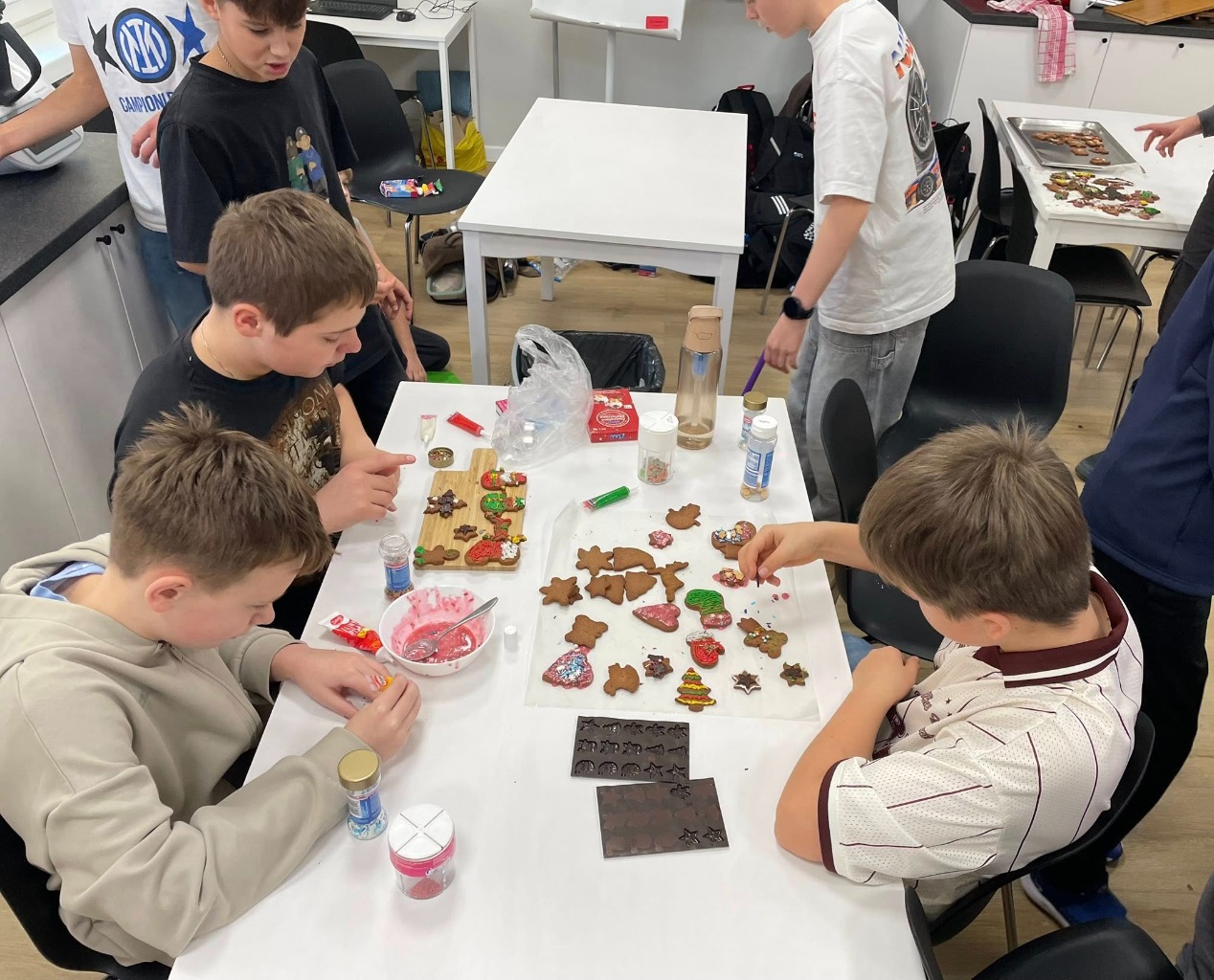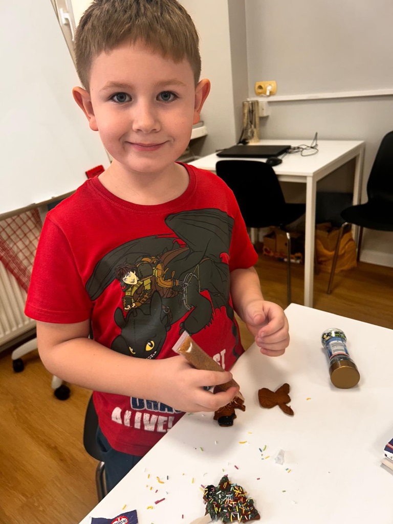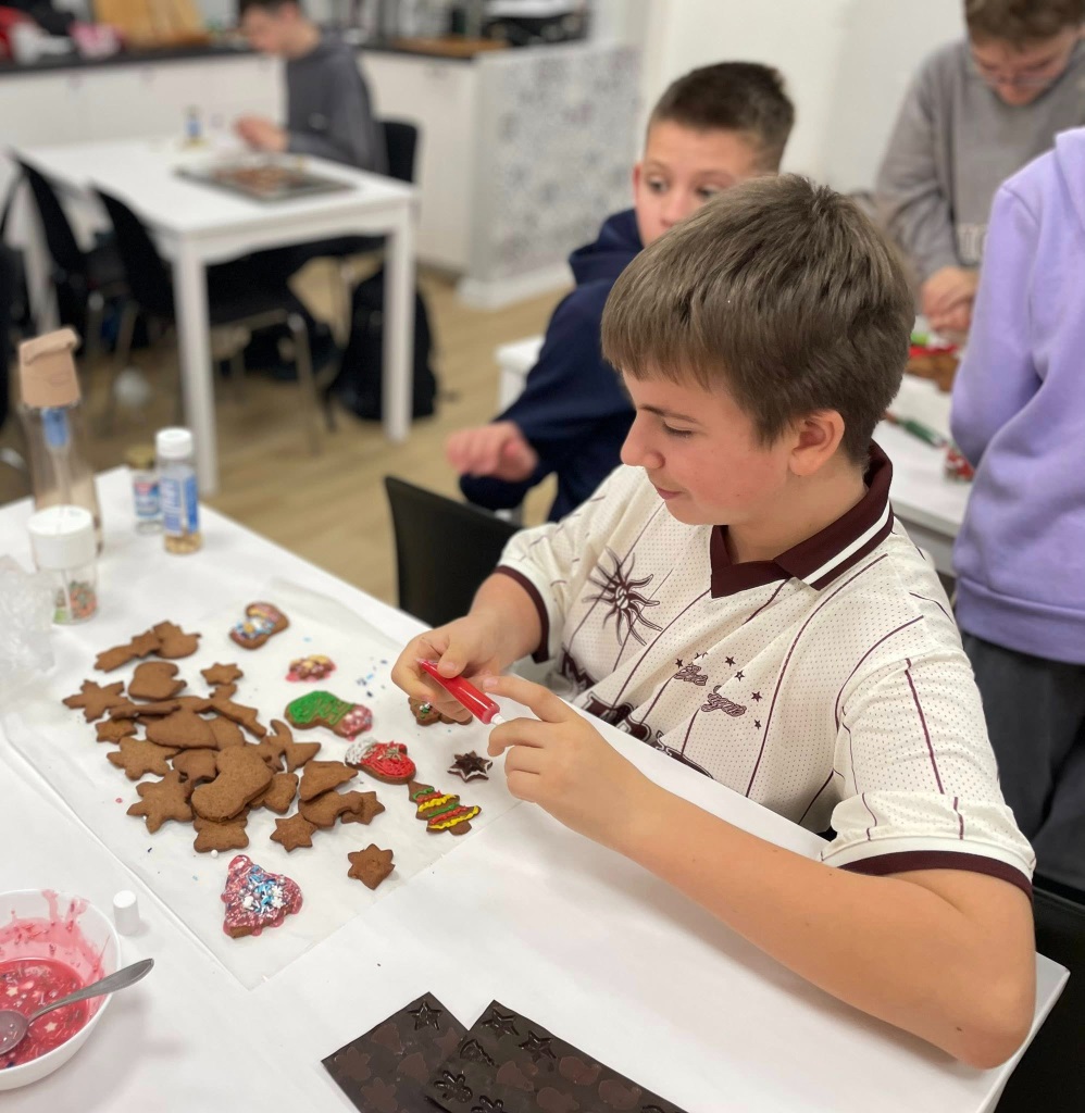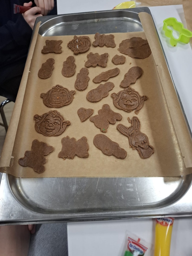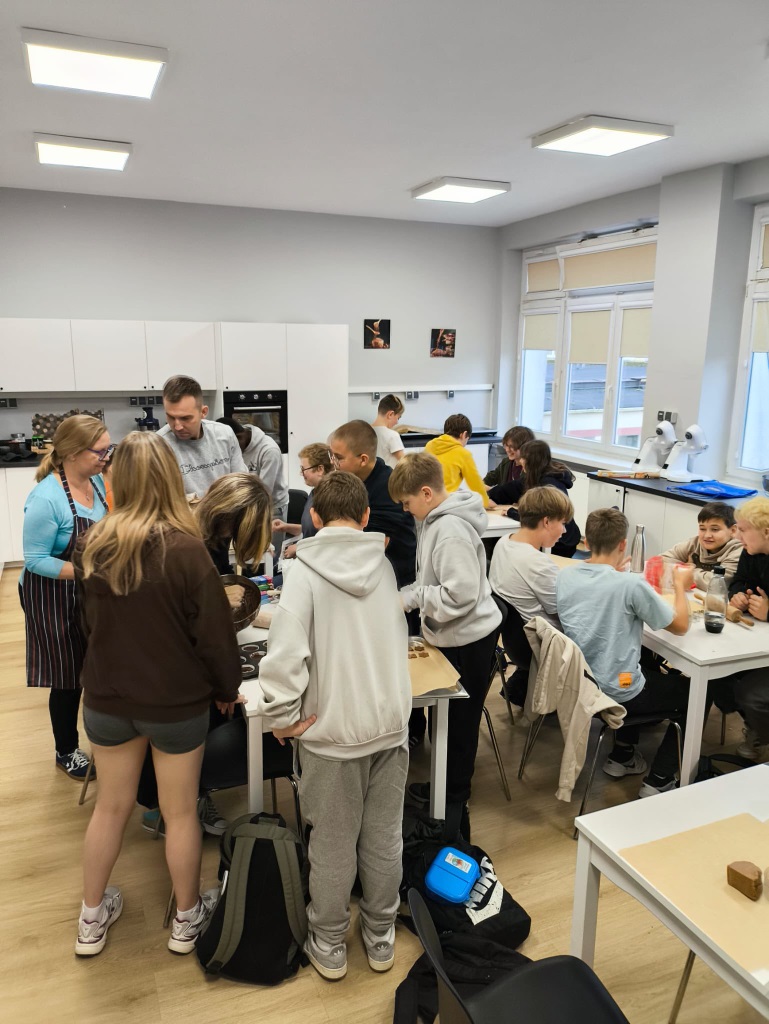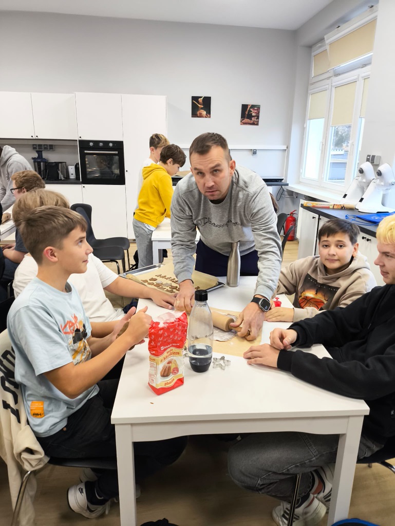 Uczniowie klasy 3a z zaangażowaniem piekli i ozdabiali pierniki, przygotowując je na świąteczny kiermasz szkolny. Wspólna praca, zapach korzennych przypraw i kreatywne dekoracje wprowadziły wszystkich w magiczny, przedświąteczny nastrój.