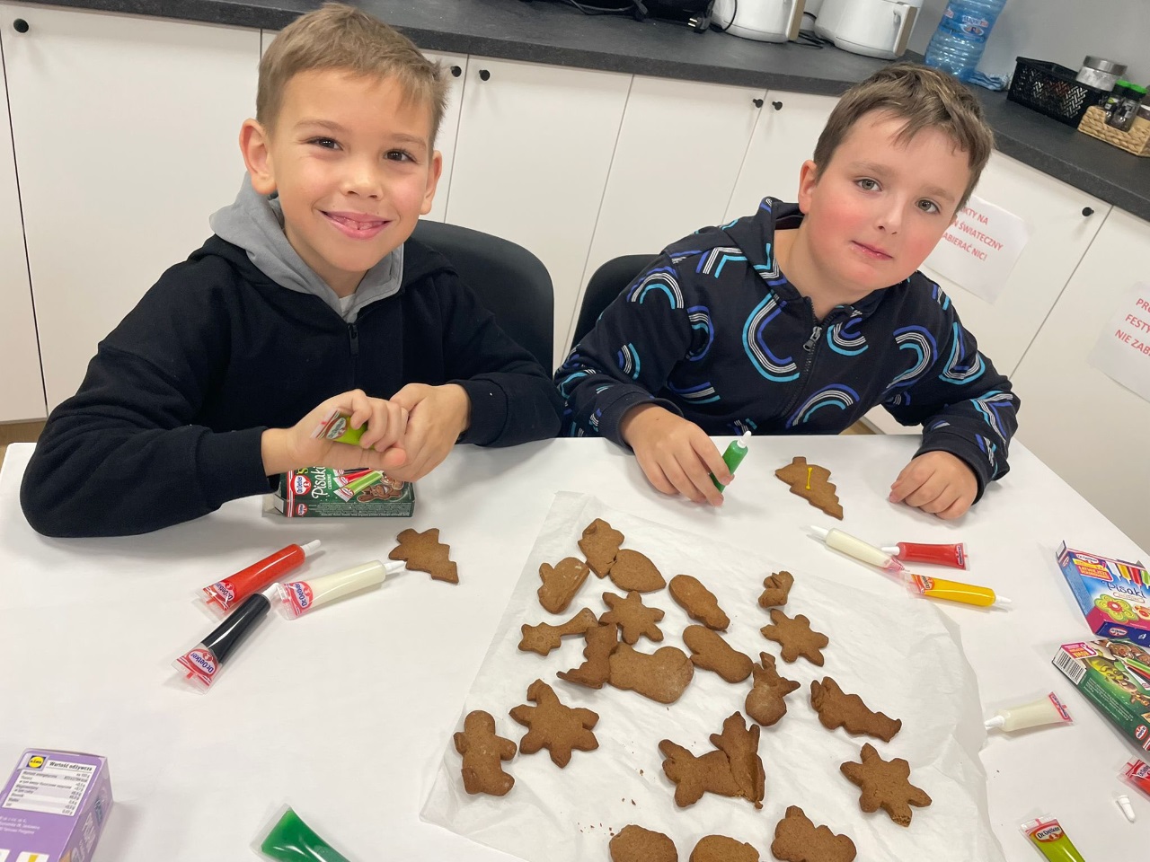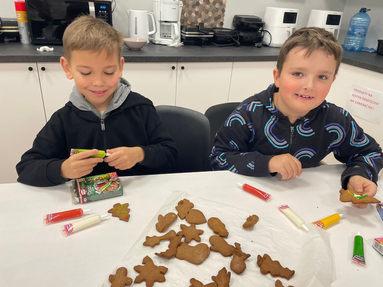 Uczniowie klasy 1a z pełnym zaangażowaniem piekli i dekorowali dziś świąteczne pierniki! ![]()