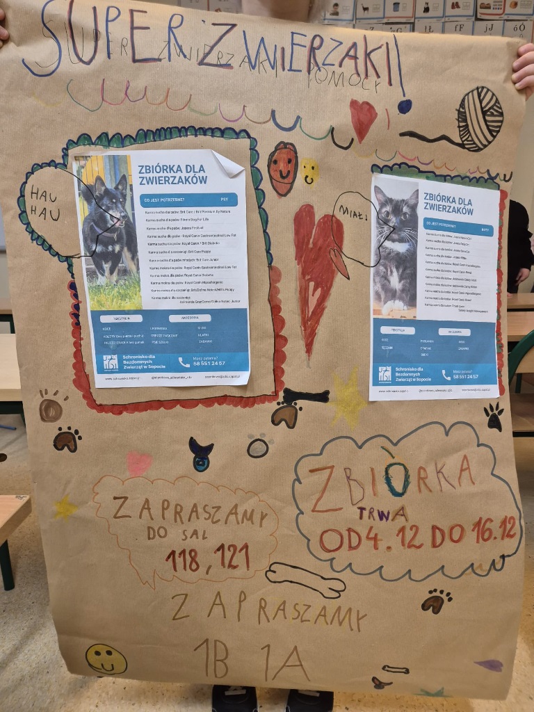 Ogłoszenia dotyczące zbiórki umieszczone są na drzwiach wejściowych do szkoły oraz na korytarzach na wszystkich piętrach. Zbiórka trwa do 16 grudnia. Następnego dnia klasa 1b zawiezie wszystkie zebrane dary do schroniska w Sopocie. Do sali 121 do 16 grudnia przynosimy wszystkie rzeczy, którymi chcemy podzielić się ze zwierzątkami.