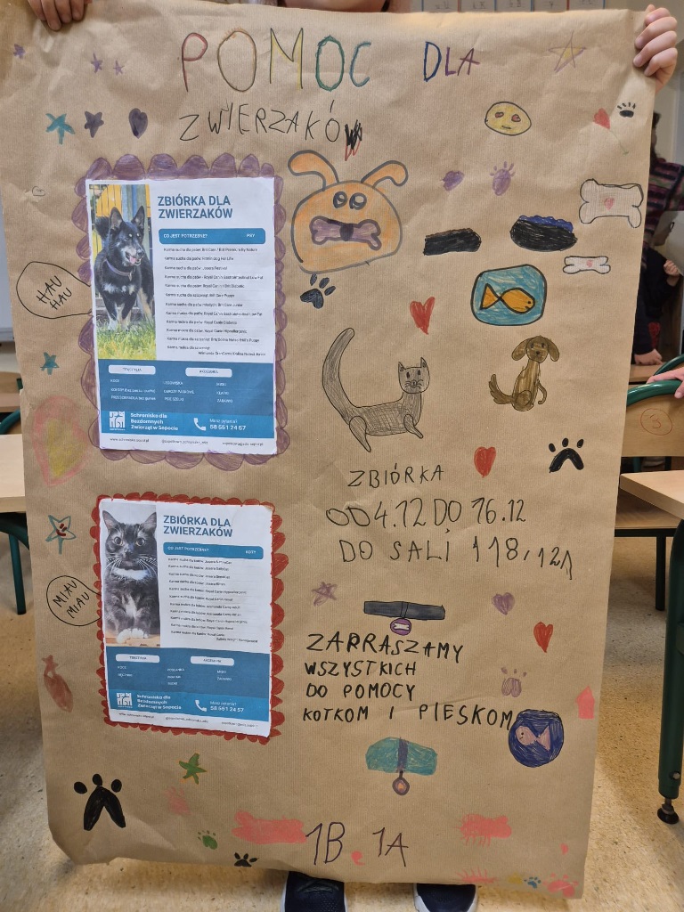 Klasy pierwsze w naszej szkole zapraszają do akcji „Pomóżmy bezdomnym zwierzętom przetrwać zimę”. Organizujemy zbiórkę potrzebnych rzeczy dla zwierzątek, które nie mają swojego domu. Zbiórka jest zorganizowana dla podopiecznych schroniska Sopotkowo w Sopocie. Zapraszamy wszystkich uczniów, rodziców i pracowników szkoły do włączenia się w tę akcję. Niech los bezdomnych zwierząt nie będzie nam obojętny. Podzielmy się sercem i dobrem — zwierzątka na pewno będą dzięki naszej pomocy szczęśliwsze.