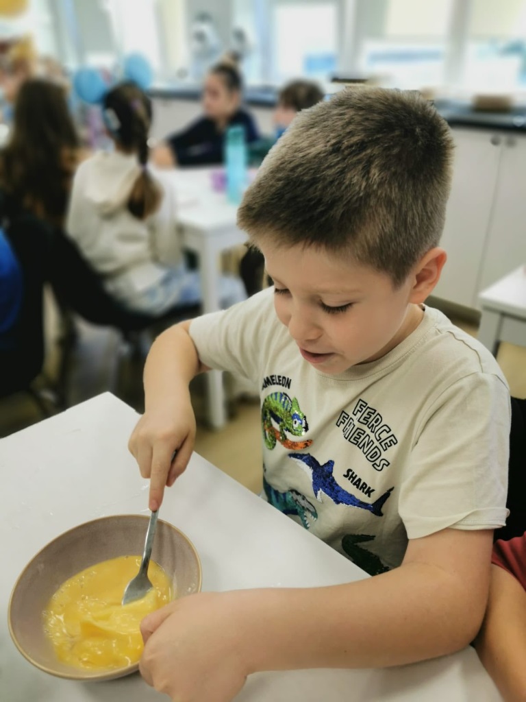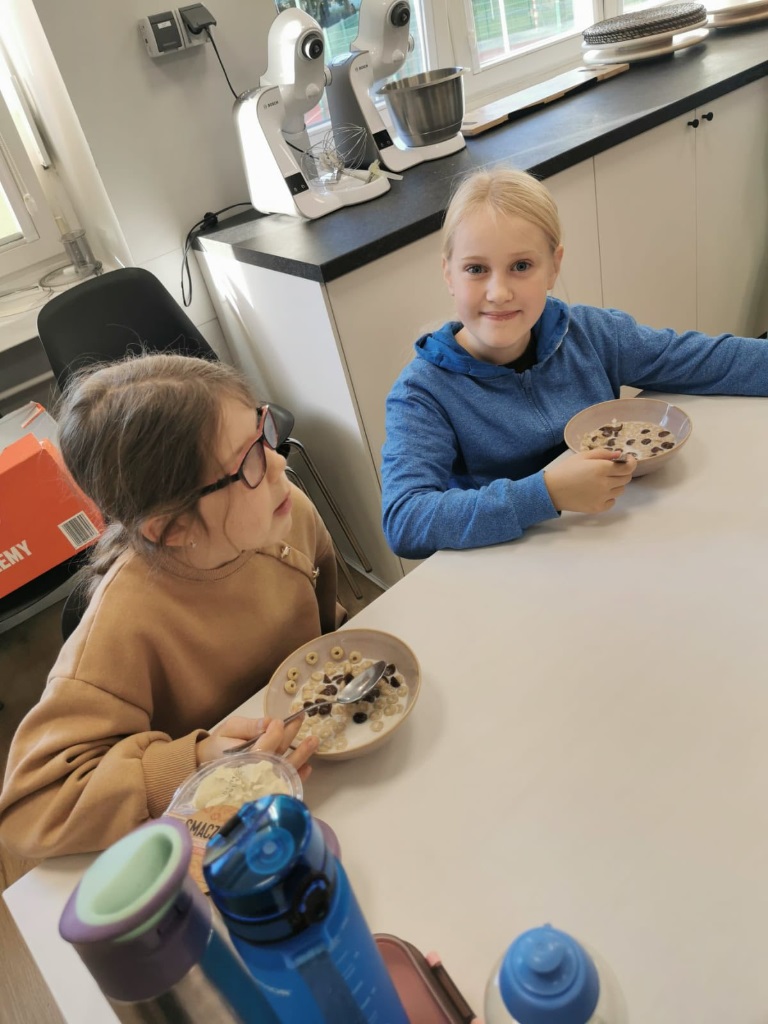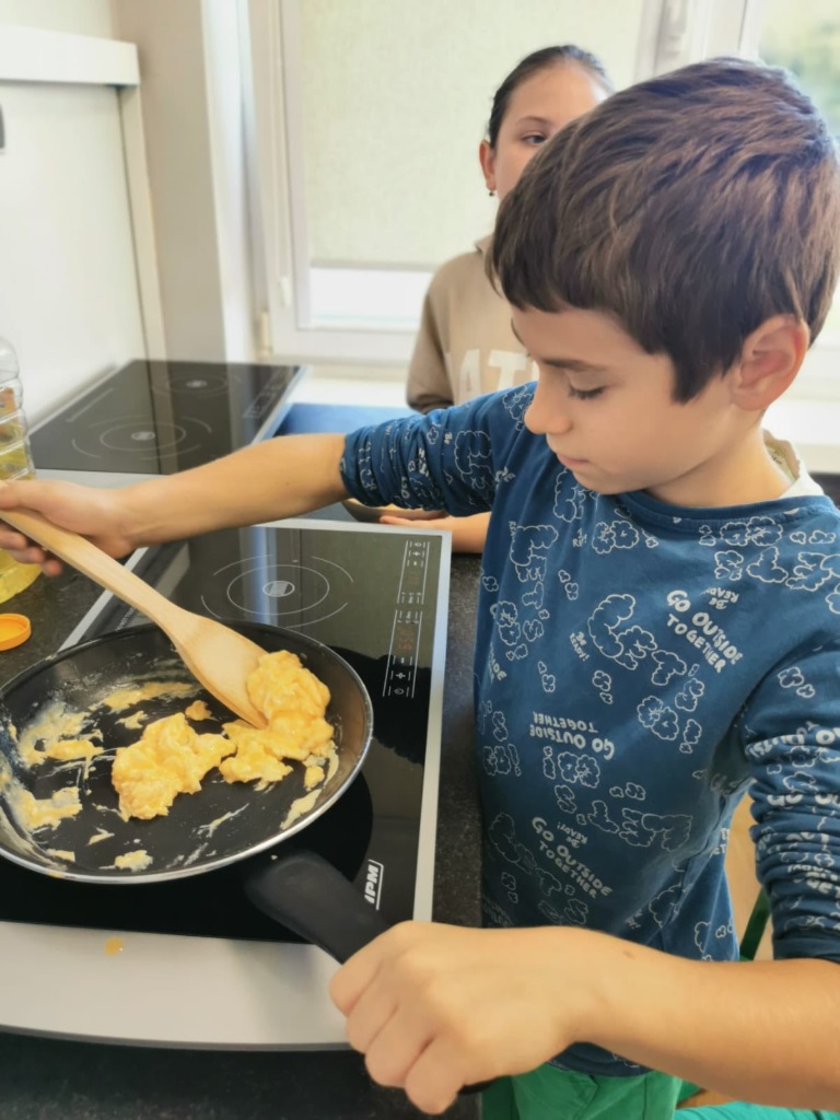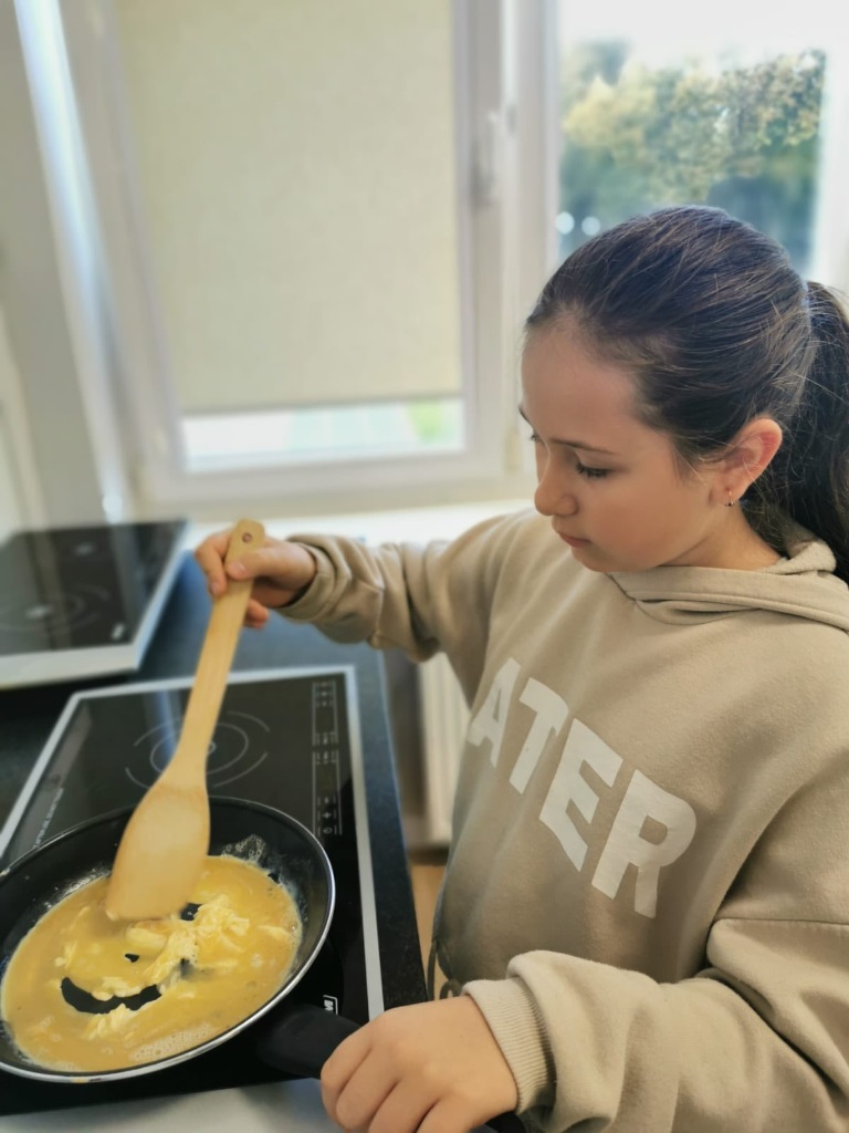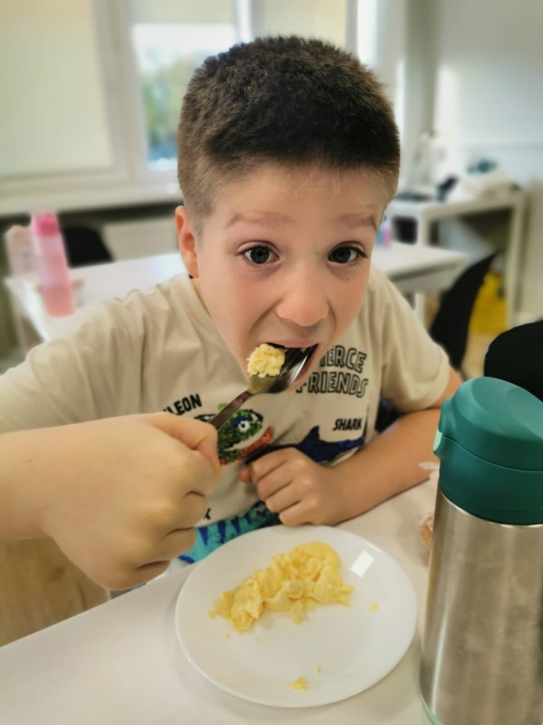 Uczniowie klasy 3a samodzielnie przygotowali pyszne śniadanie – smażyli jajecznicę, robili chrupiące tosty i podgrzewali mleko do płatków.