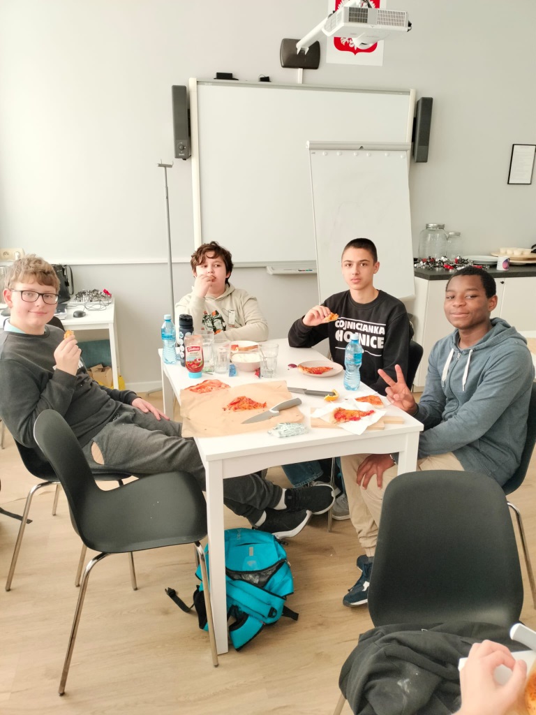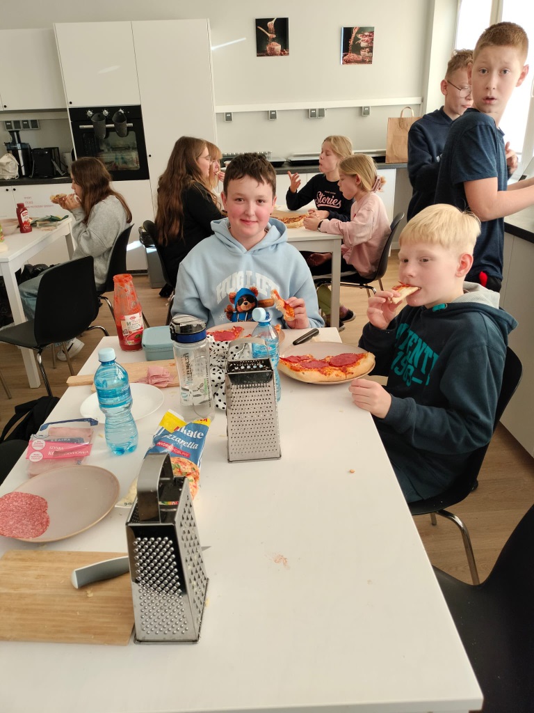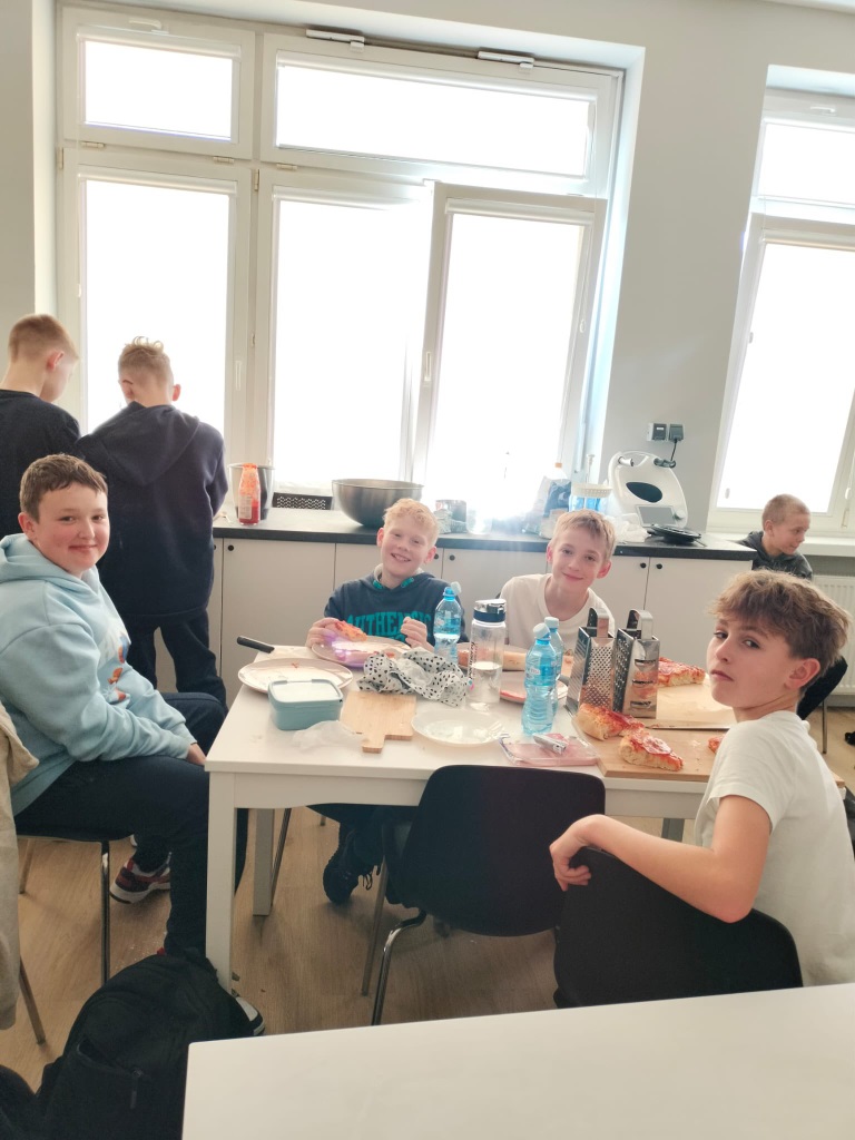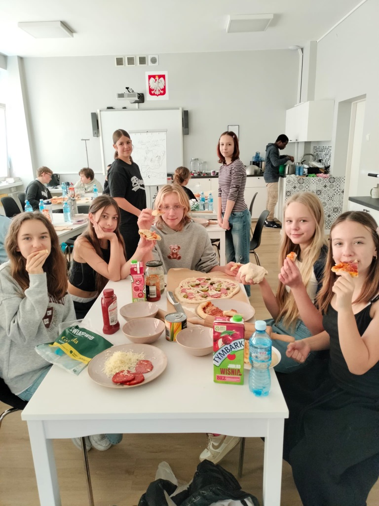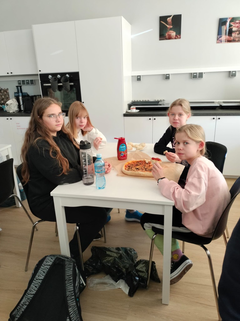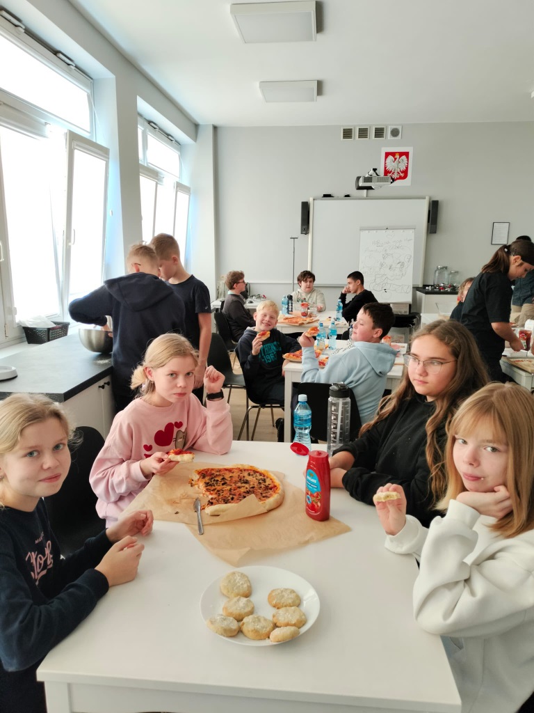 Klasa 6b z wychowawcą w szkolnej pracowni kulinarnej. Uczniowie w grupach własnoręcznie zrobili ciasta drożdżowe do pizzy. Następnie po wyrośnięciu ciasta uformowali spody do pizzy, na spody passata, ulubione dodatki i do pieca. Pizze były pyszne. Dziękujemy Paniom kucharkom za upieczenie.