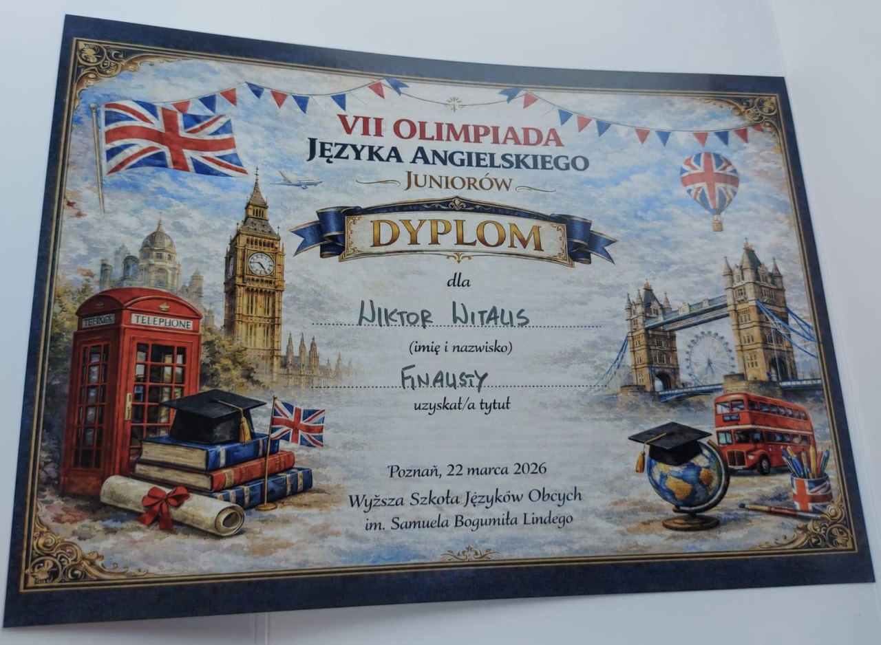 Serdeczne gratulacje dla Wiktora z klasy 8b, który został finalistą VII Ogólnopolskiej Olimpiady Języka Angielskiego Juniorów. W Olimpiadzie wzięło udział 750 szkół w Polsce. Wiktor zaczynał w grupie 15000 uczniów. To prawdziwa radość uczyć tak wybitnego Ucznia. ![]()
