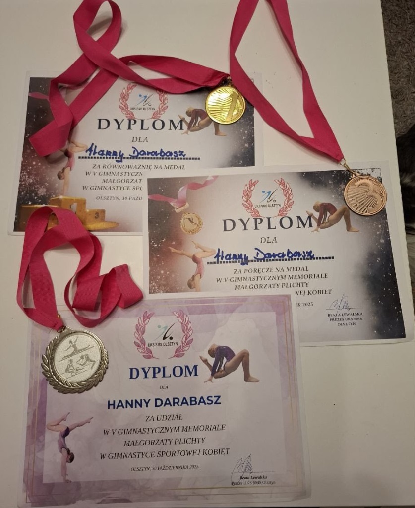 Uczennica klasy 1b - Hania Darabasz wzięła udział w V Memoriale Małgorzaty Plichty w Olsztynie, gdzie zaprezentowała się znakomicie. Zdobyła 2. miejsce w wieloboju, 3. miejsce na poręczach oraz 1. miejsce na belce. Jej osiągnięcia są powodem do ogromnej dumy i świadczą o wielkim zaangażowaniu oraz talentach sportowych. ![]()