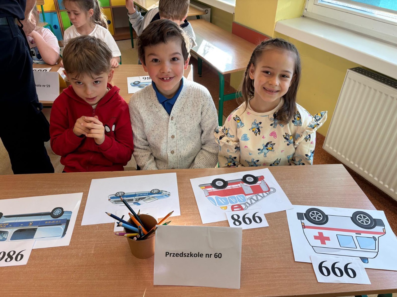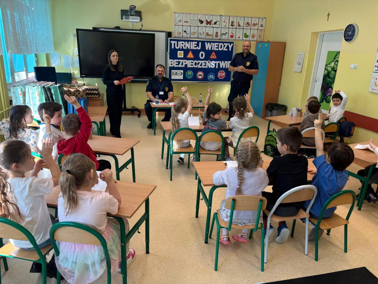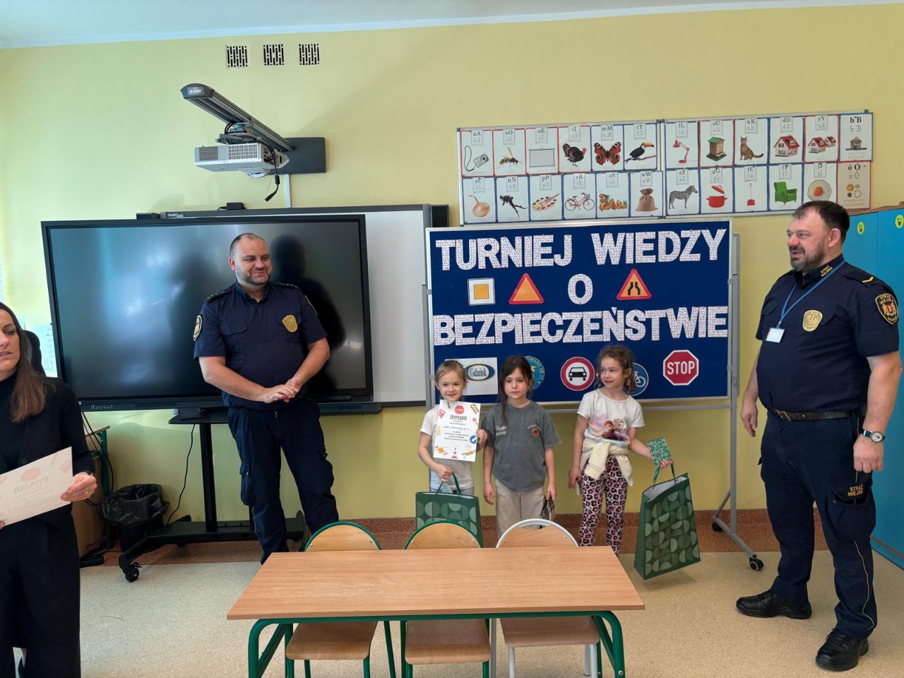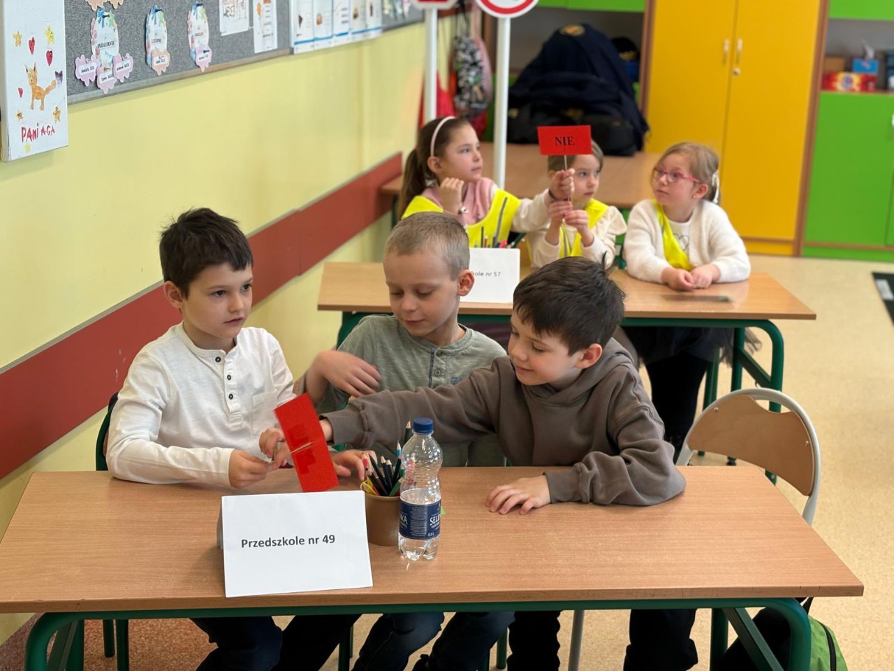 Mali uczestnicy z ogromnym zaangażowaniem i entuzjazmem podejmowali kolejne turniejowe wyzwania. Rozwiązywali zagadki dotyczące zasad bezpieczeństwa, odpowiadali na pytania oraz prezentowali, jak prawidłowo i bezpiecznie przechodzić przez przejście dla pieszych. Przedszkolaki wykazały się dużą wiedzą oraz świetnym przygotowaniem.