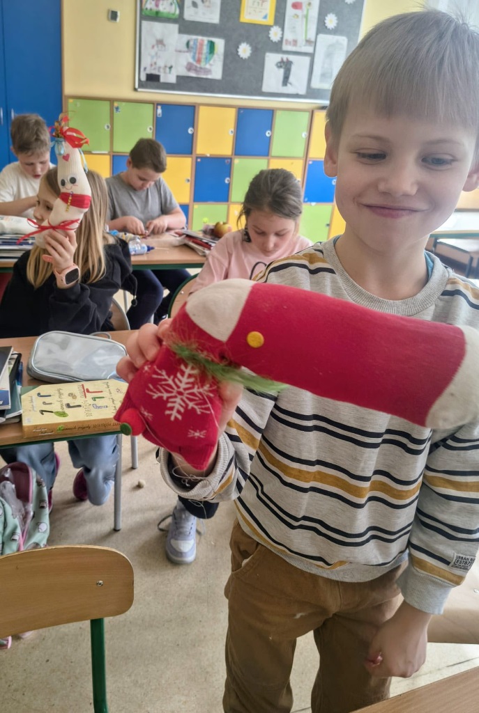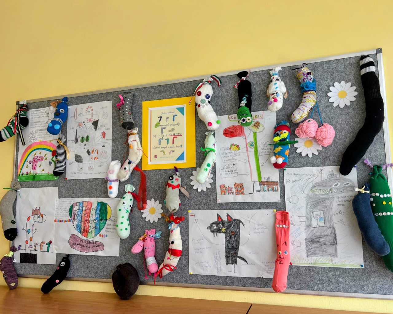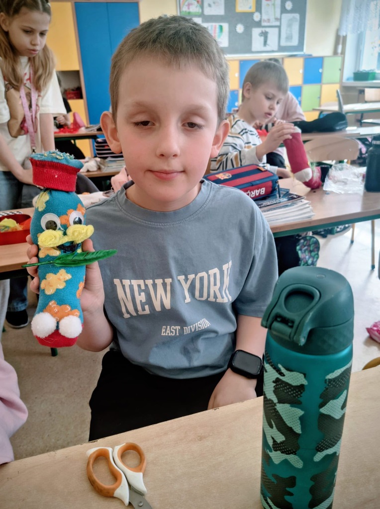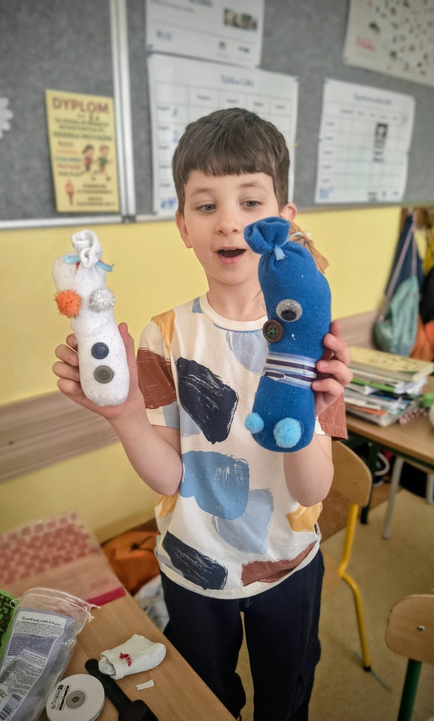 Twórcze podsumowanie pracy z lekturą "Niesamowite przygody dziesięciu skarpetek", która zdobyła serca uczniów klasy 2a. Bohaterowie książki stali się inspiracją do stworzenia własnych skarpetkowych pluszaków.