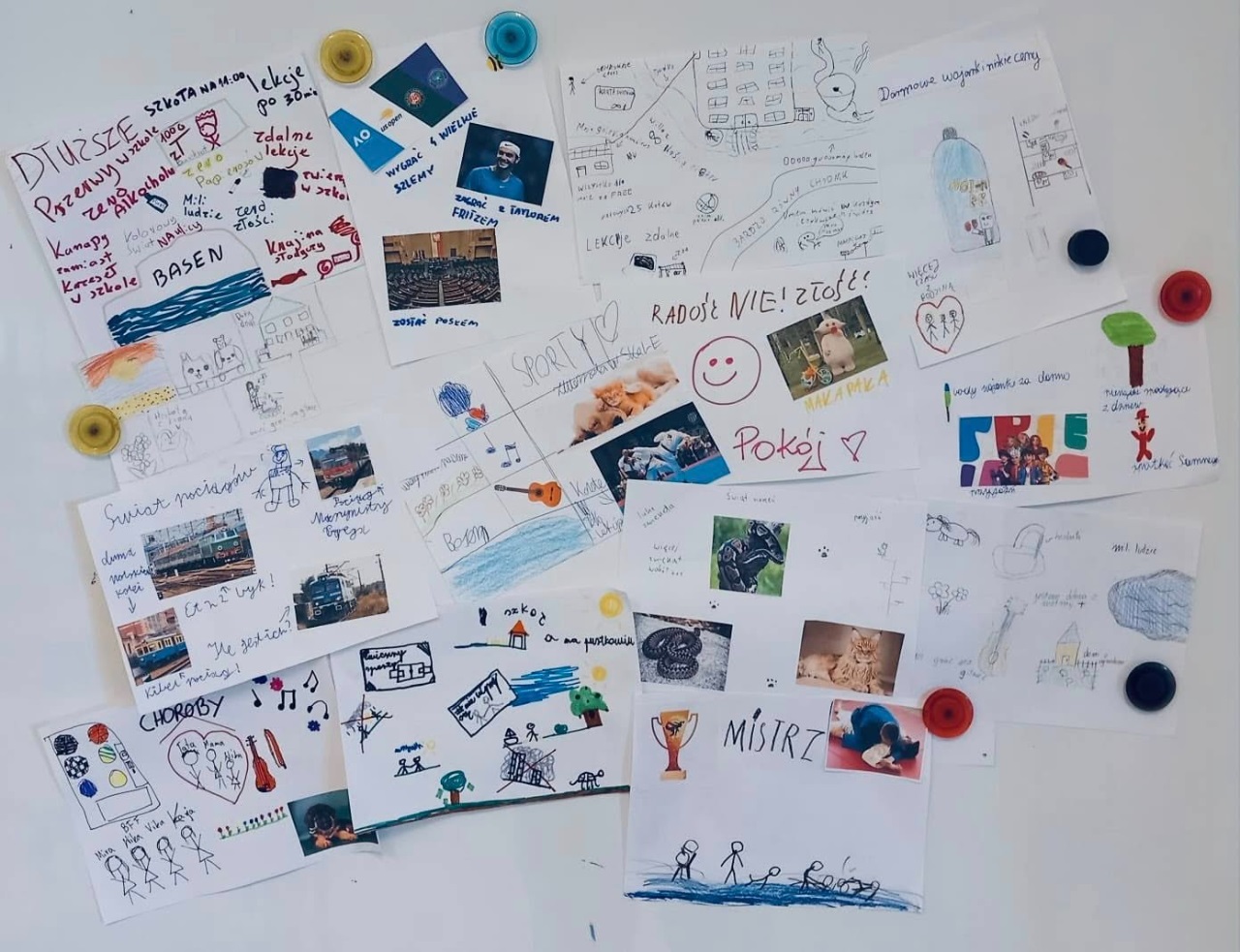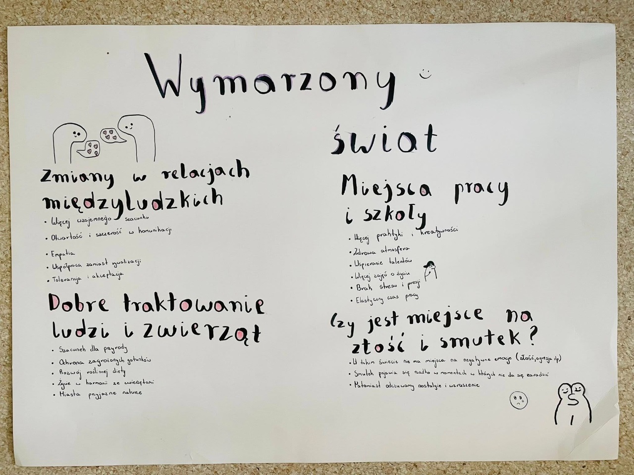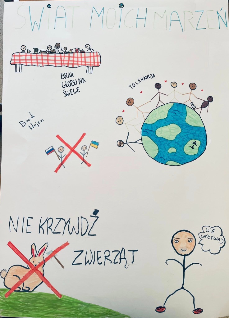 Na kolorowych pracach dzieci przedstawiły swoje wizje idealnego świata – pełnego radości, życzliwości i wzajemnego zrozumienia.