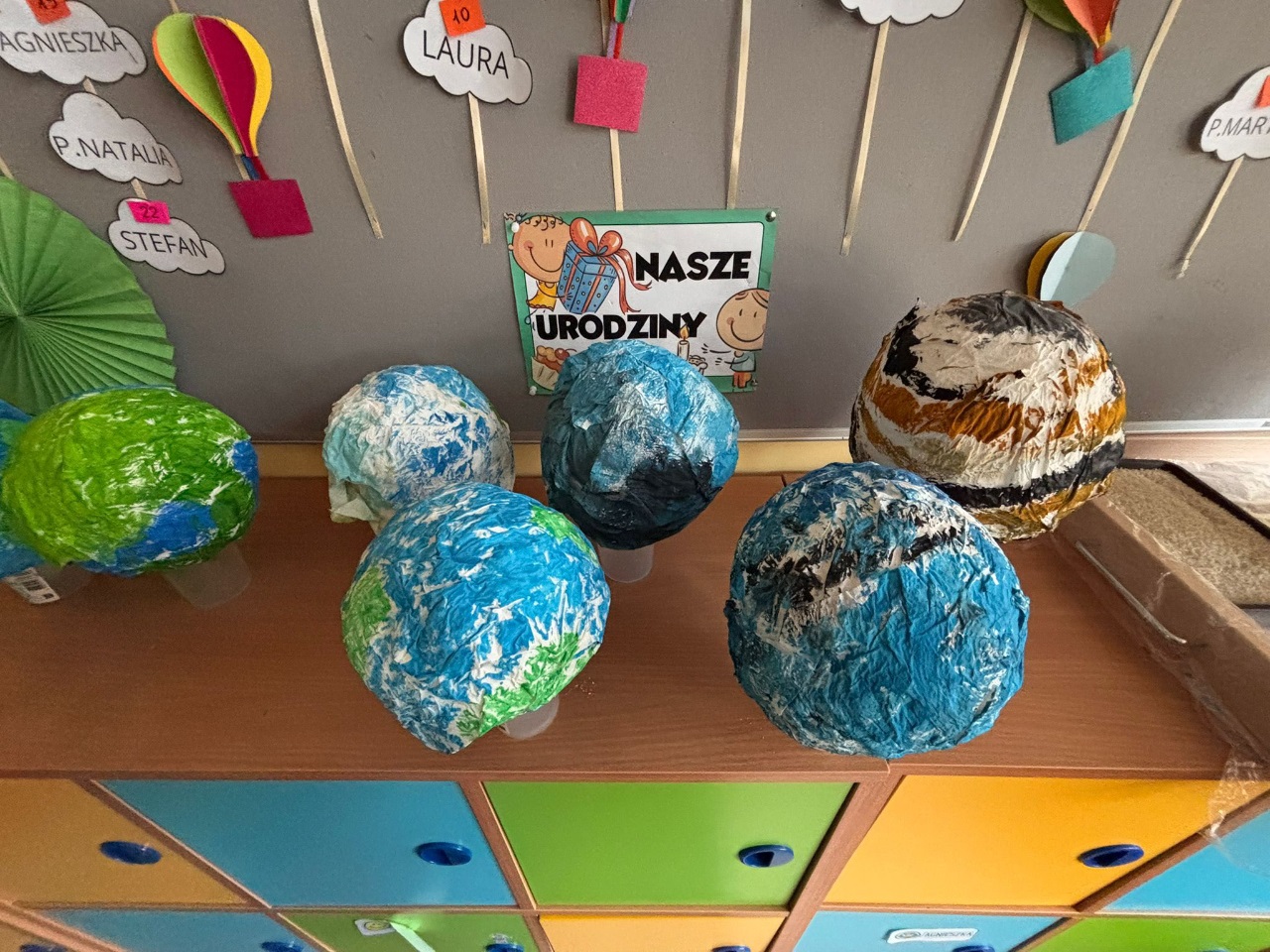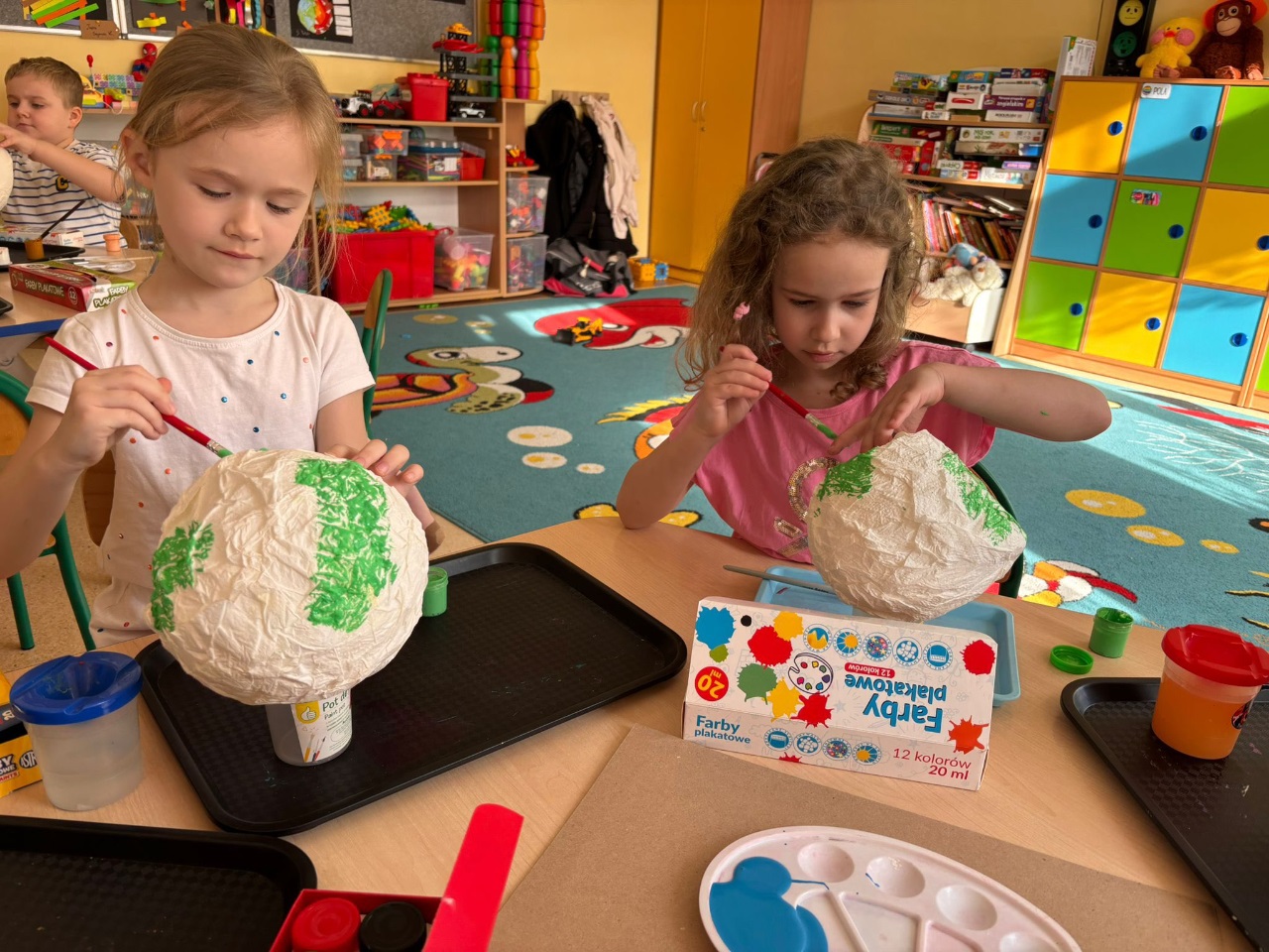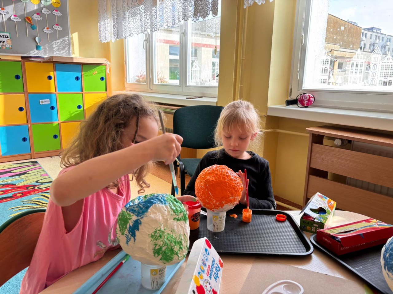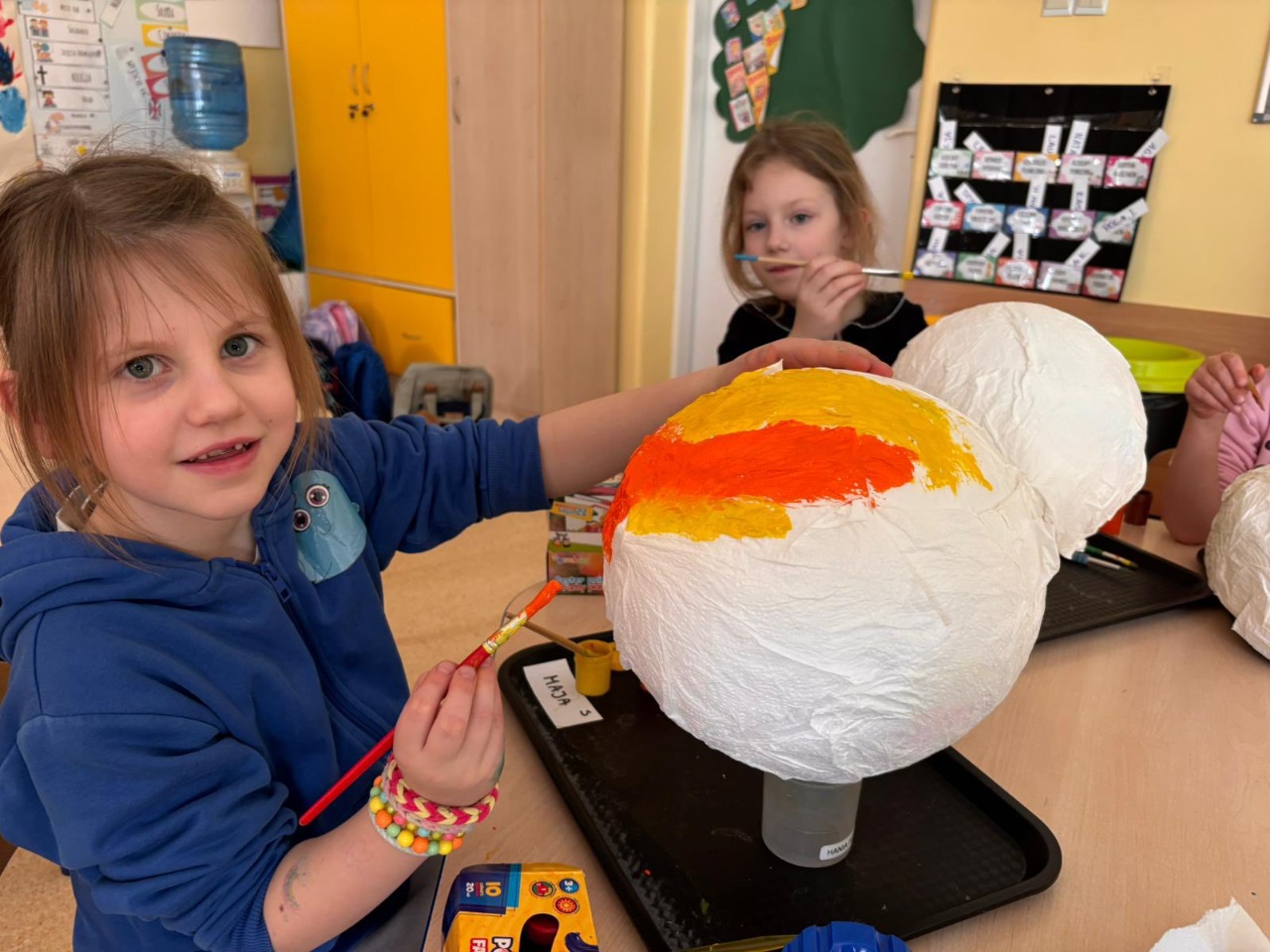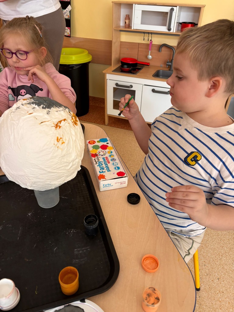 Układ Słoneczny w zerówce. Dzieci samodzielnie otworzyły kształt wybranej przez siebie planety następnie pomalowały przy użyciu farb.