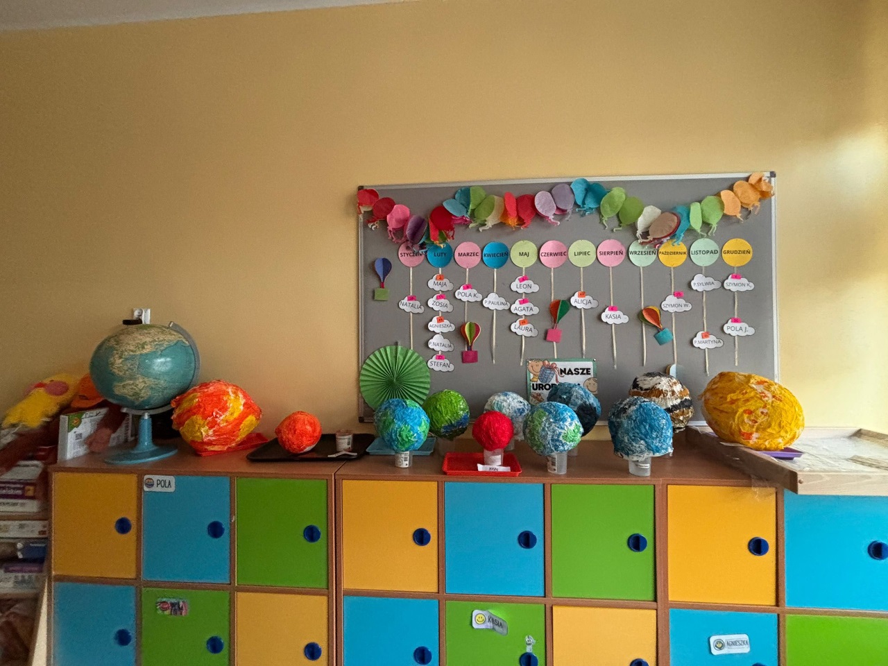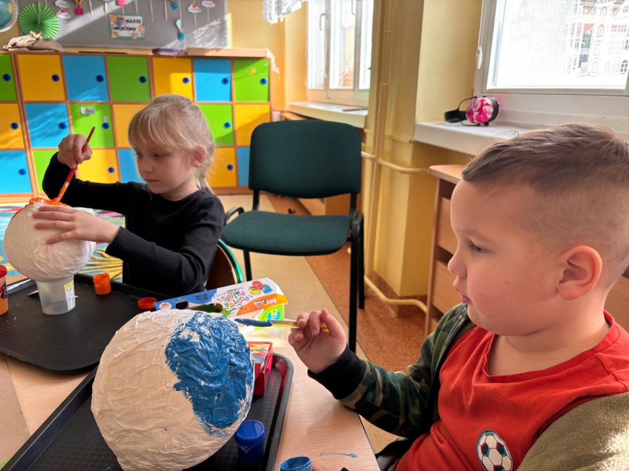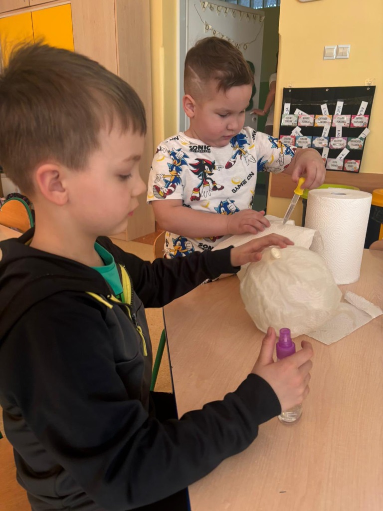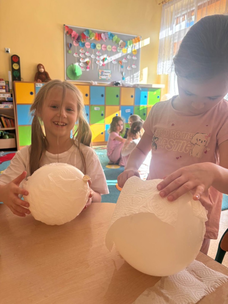 Układ Słoneczny w zerówce. Dzieci samodzielnie otworzyły kształt wybranej przez siebie planety następnie pomalowały przy użyciu farb.