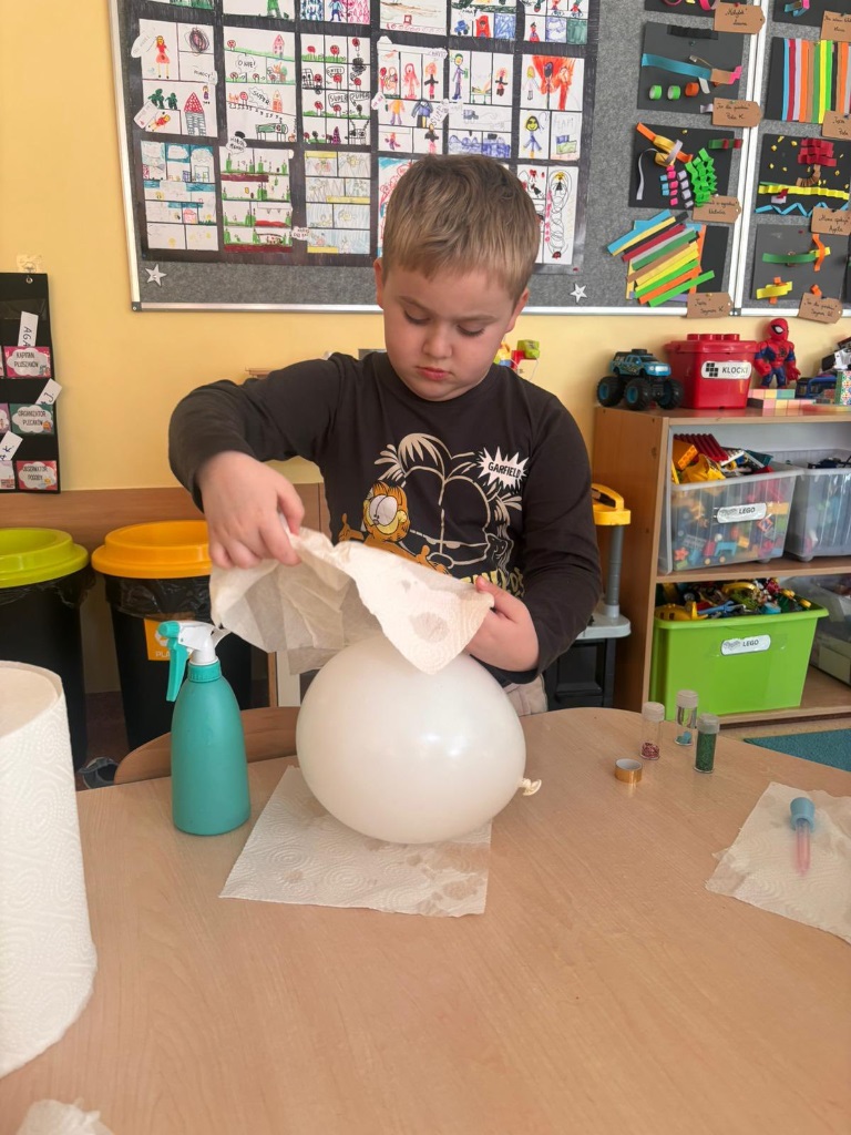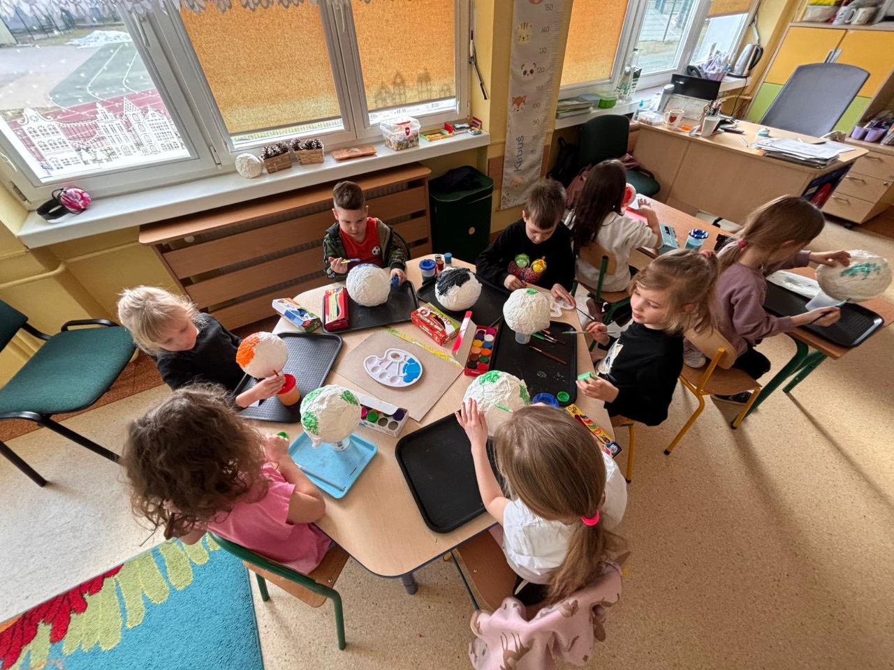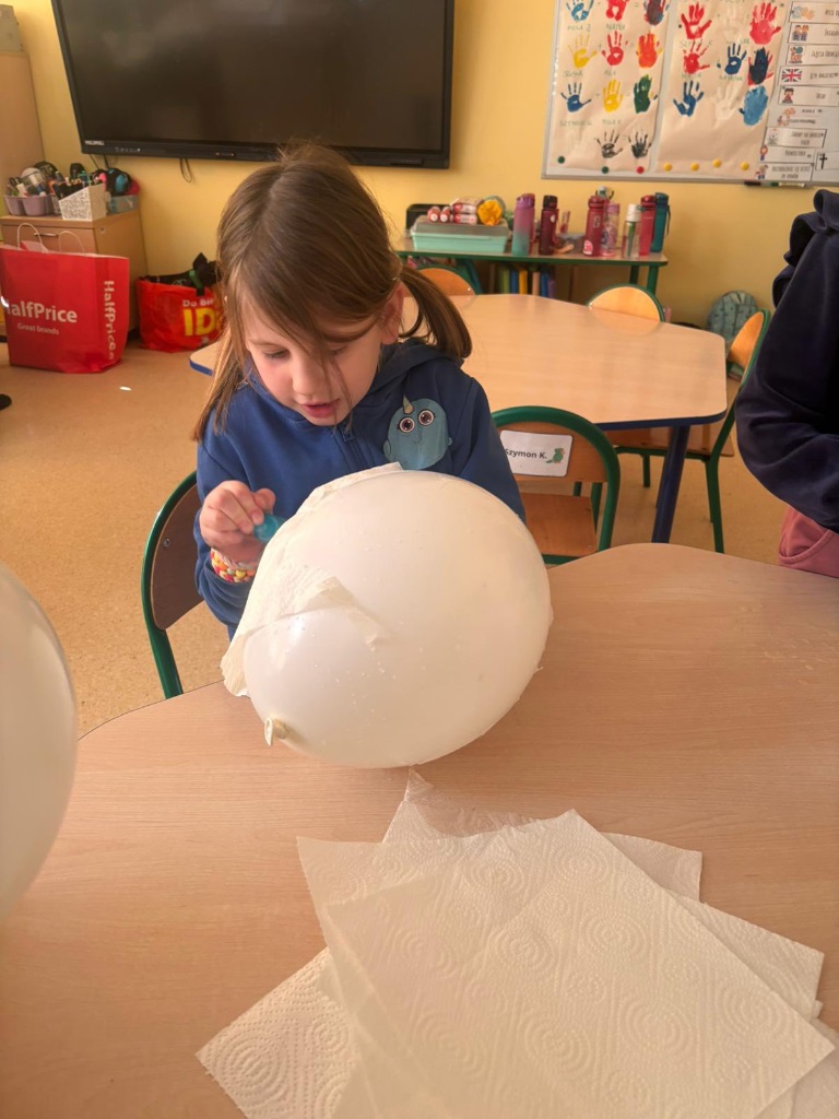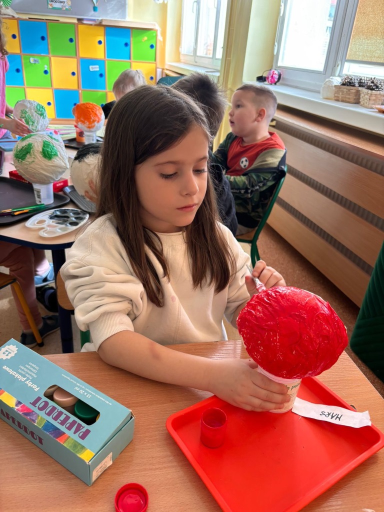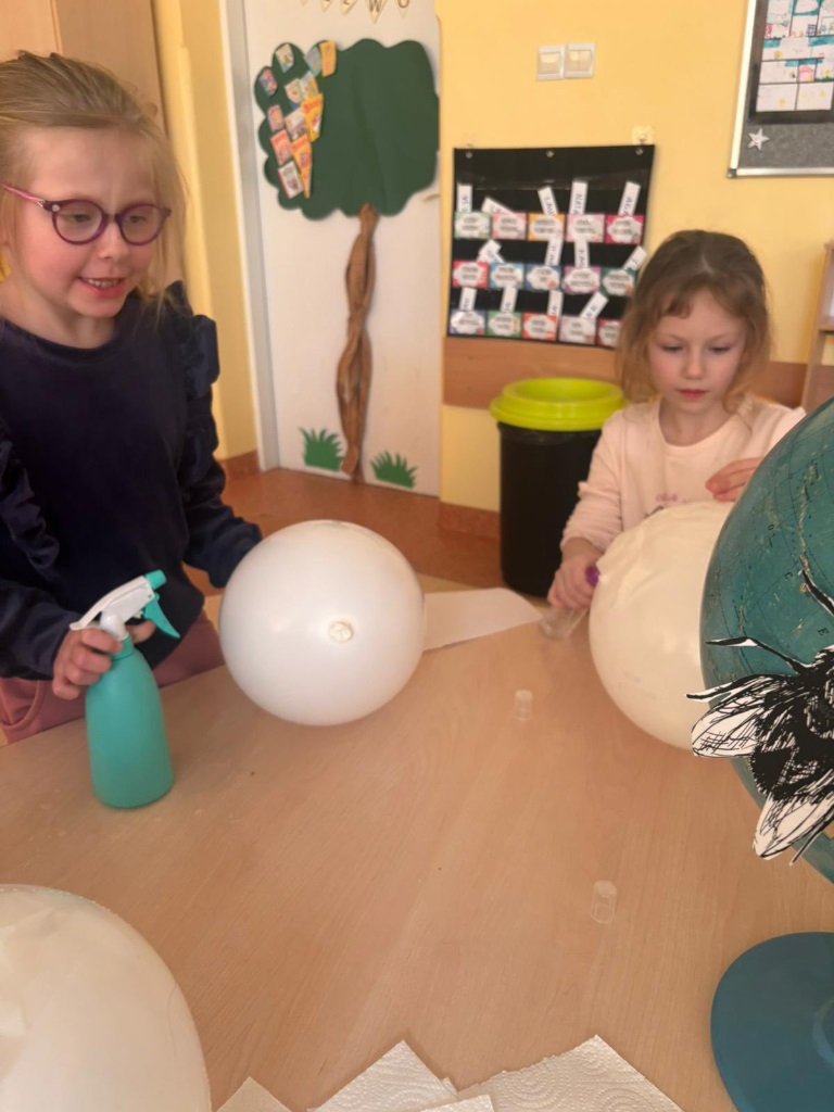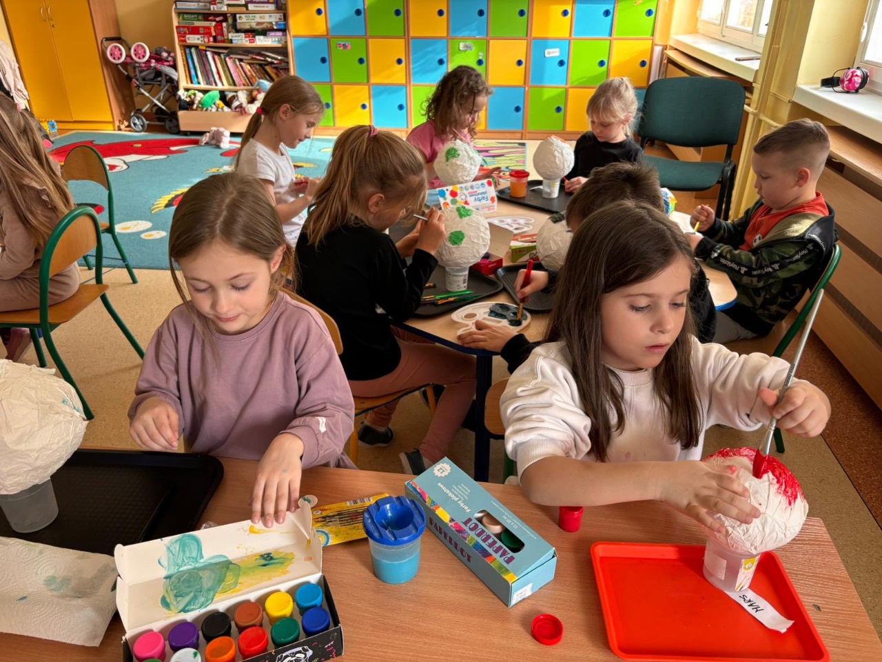 Układ Słoneczny w zerówce. Dzieci samodzielnie otworzyły kształt wybranej przez siebie planety następnie pomalowały przy użyciu farb.