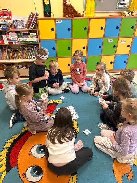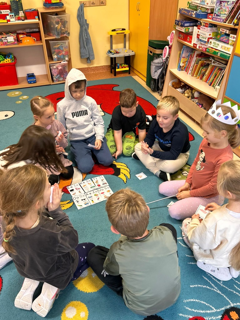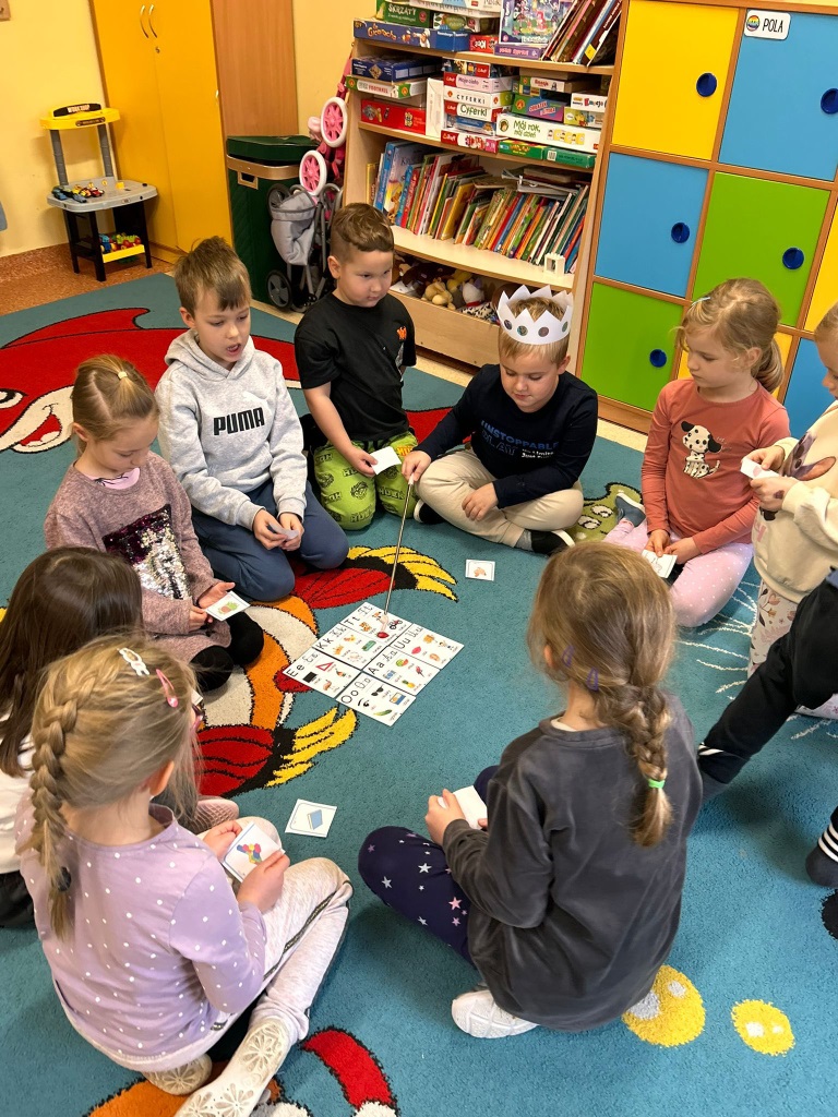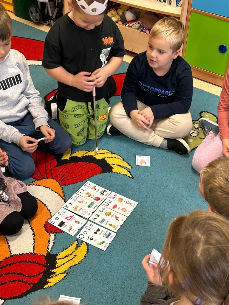 Utrwalaliśmy literkę „k” oraz inne wcześniej wprowadzone literki podczas zabawy „Polowanie króla na literę K”