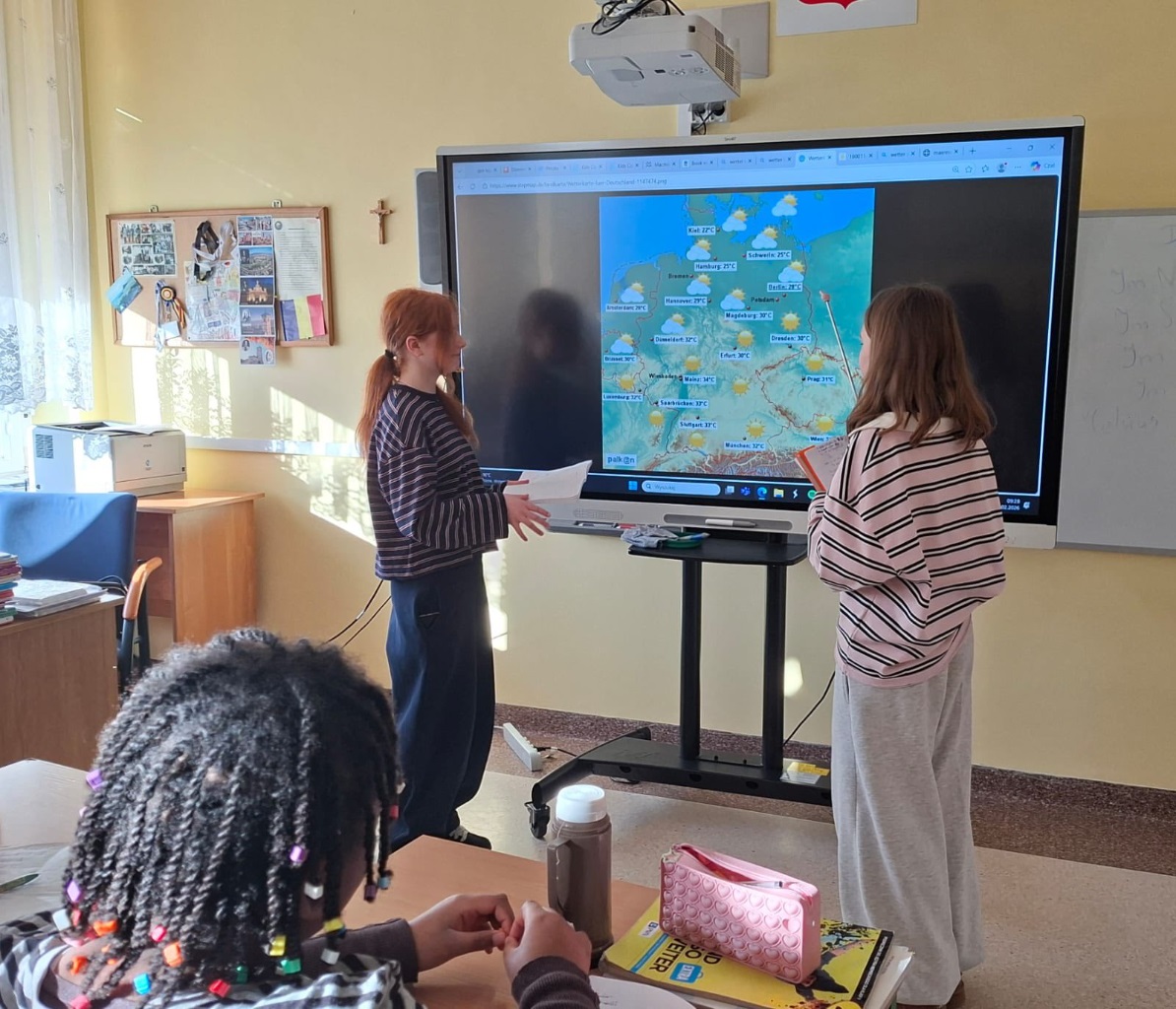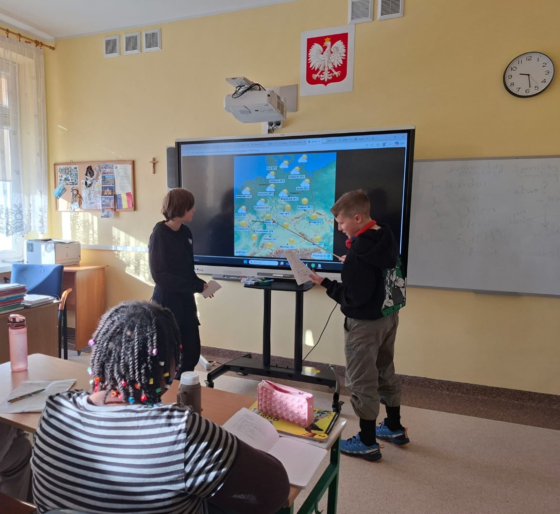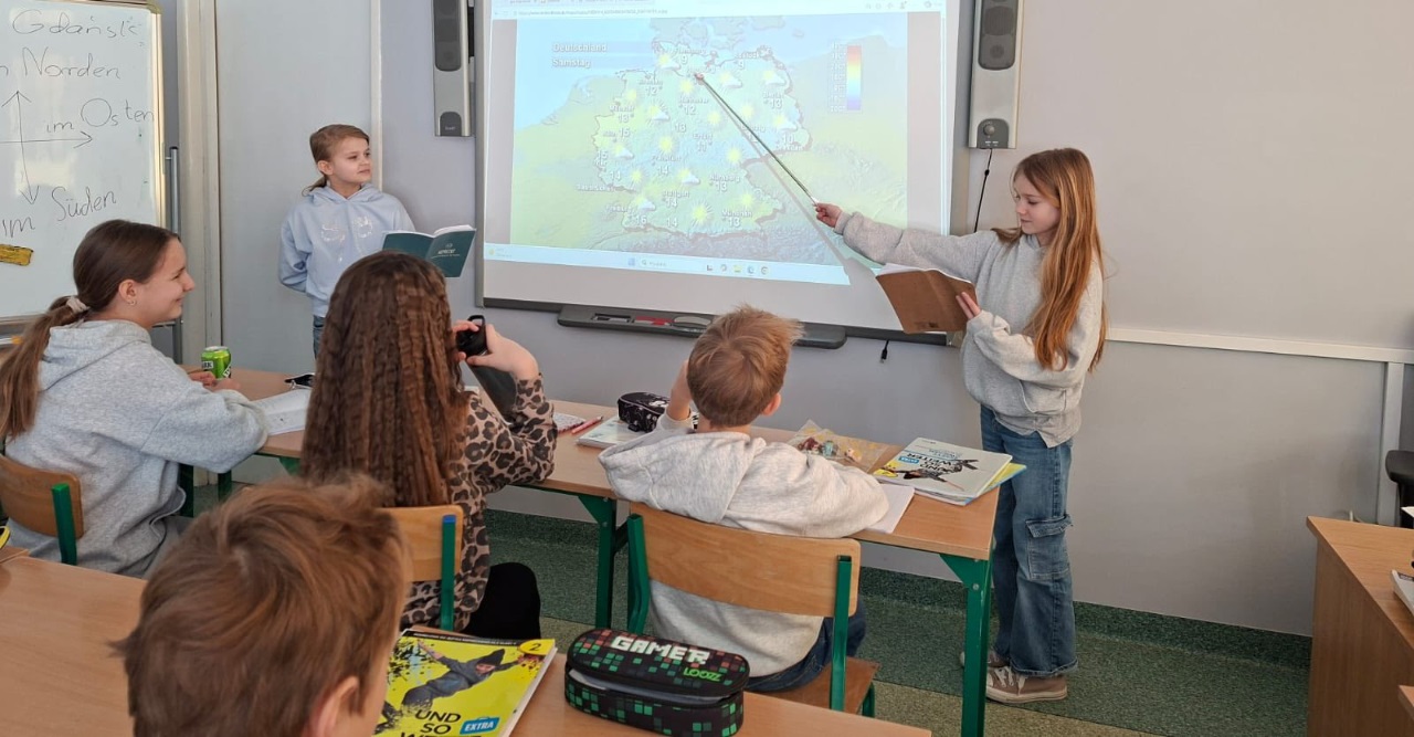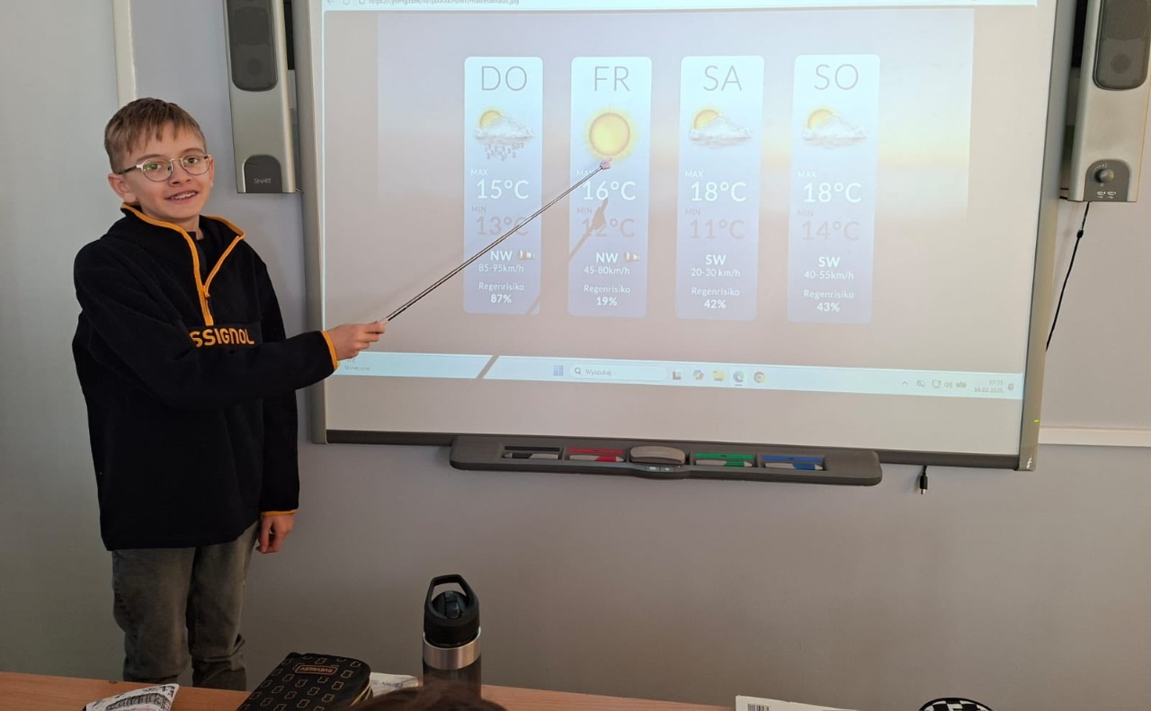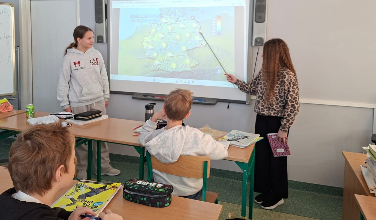 Wie ist das Wetter? Dzieci na języku niemieckim wcieliły się w role synoptyków i prezenterów, ćwicząc umiejętności językowe i geograficzne, stworzyli również własną pogodę dla danego regionu w kraju i śledzą odtąd autentyczne prognozy, czy i kiedy ta przygotwana przez nich się sprawdzi. ![]()