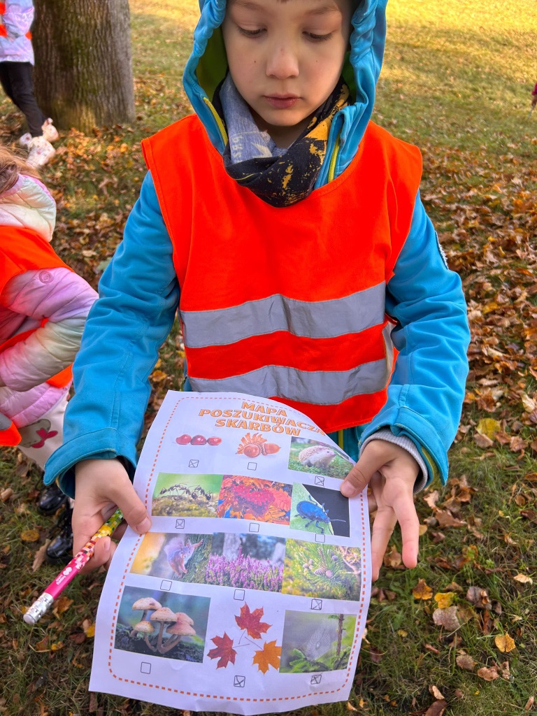 Jesień w pełni, więc nasza zerówka wybrała się na poszukiwanie jesiennych skarbów. Z mapą w dłoni odkrywaliśmy naturę ćwicząc naszą spostrzegawczość i uważność