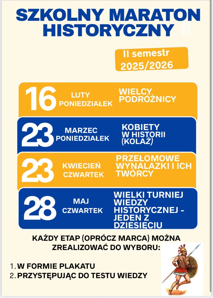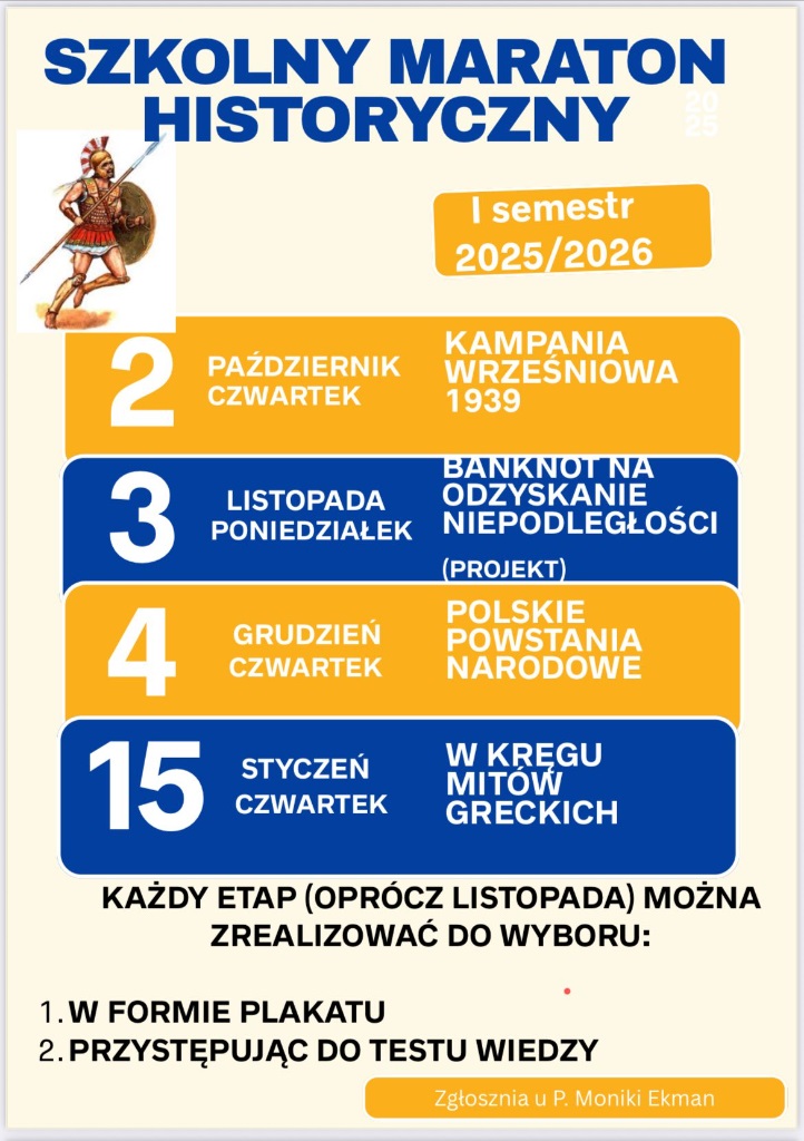 Ruszył całoroczny, wewnątrzszkolny Maraton Historyczny. Do udziału zapraszam pasjonatów historii (i nie tylko) z klas 4-8! Szczegóły i zapisy w sali 206. M. Ekman